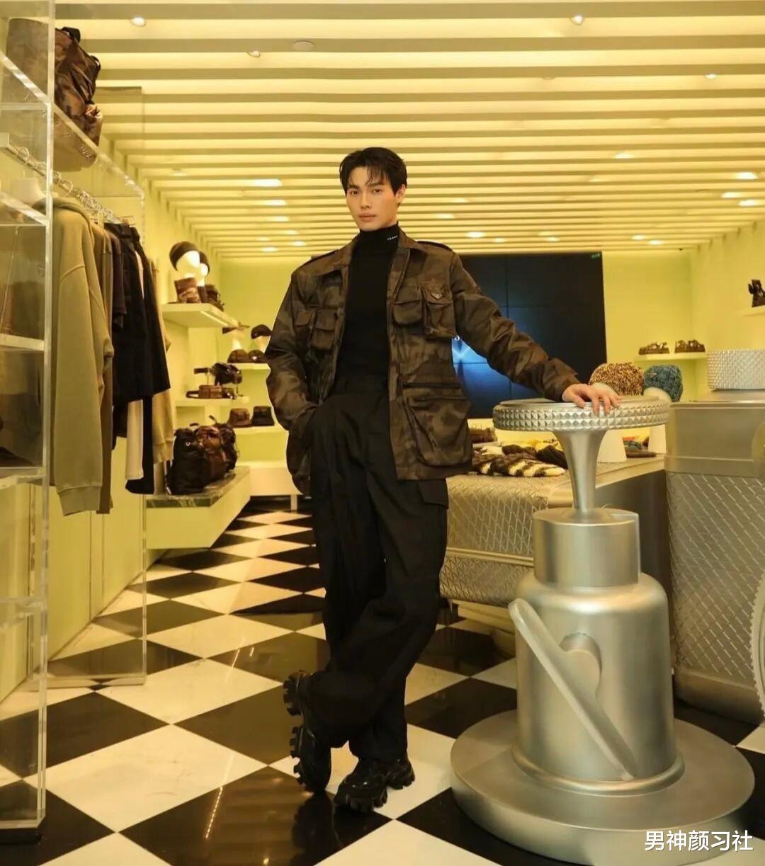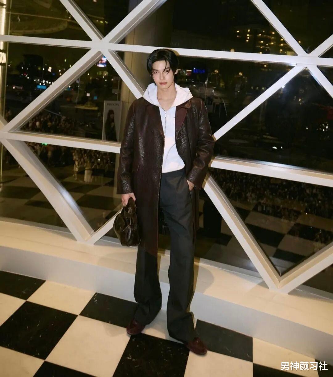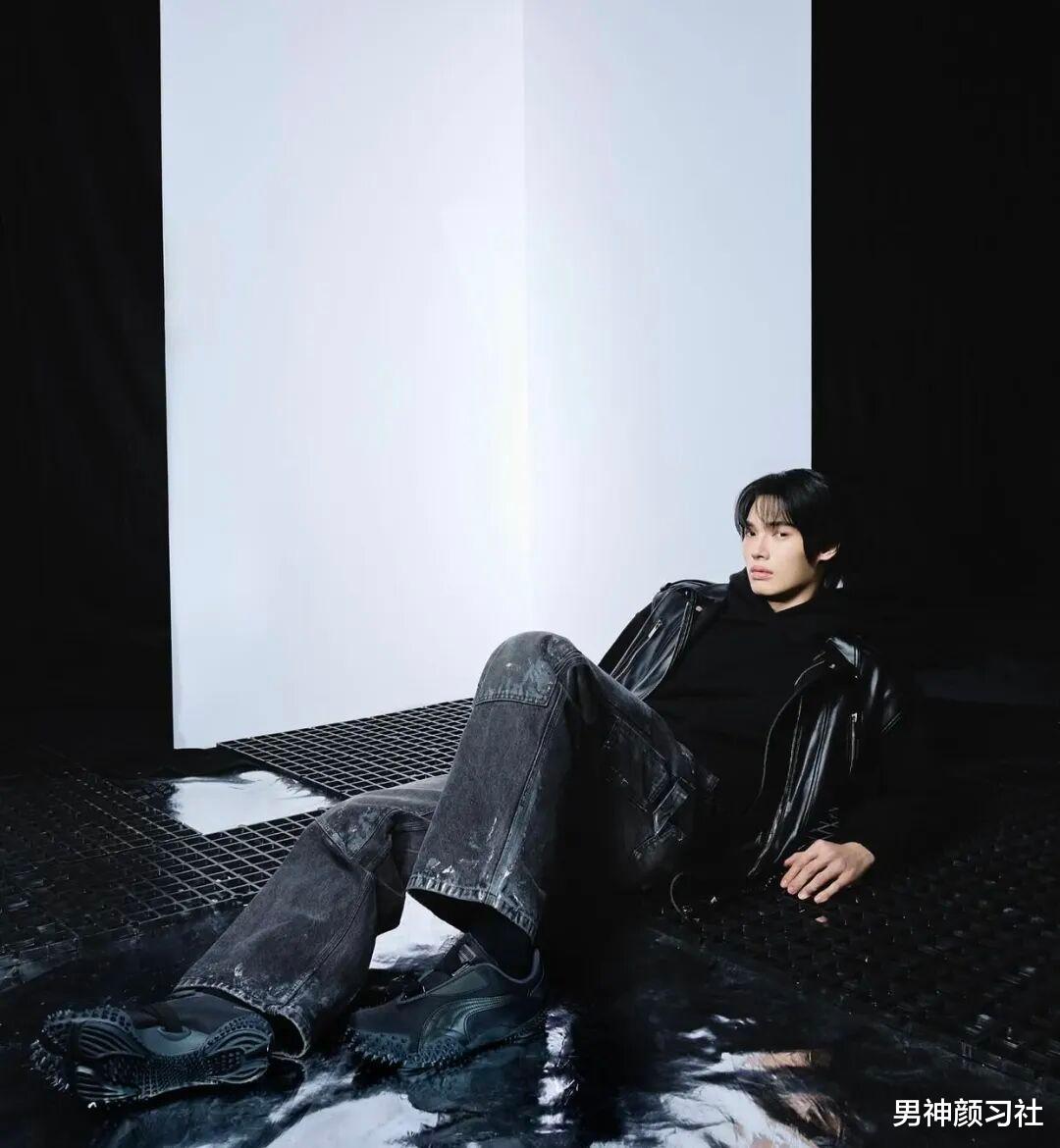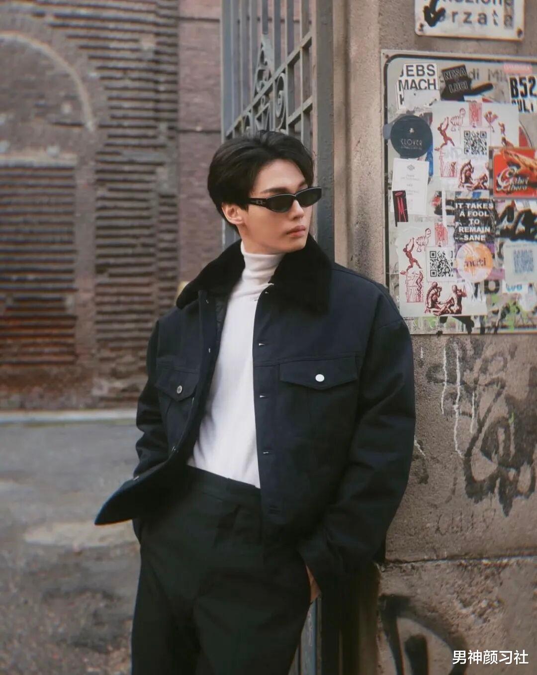 很多人觉得黑色外套很无聊,但 Win 却能穿出层次感。他的秘诀是:在黑色外套里面穿一件浅灰色毛衣。灰色是介于黑白之间的高级中性色,它既能提亮黑色,又不像白色那样对比强烈。