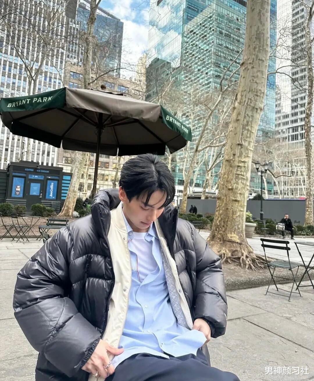无论是毛绒绒短款外套还是羽绒服,Win 都深知叠穿的重要性。对于羽绒服这种易显臃肿的单品,他采用三明治叠穿法:长袖打底 + 衬衫 + 夹克,最后再套上黑色羽绒服。