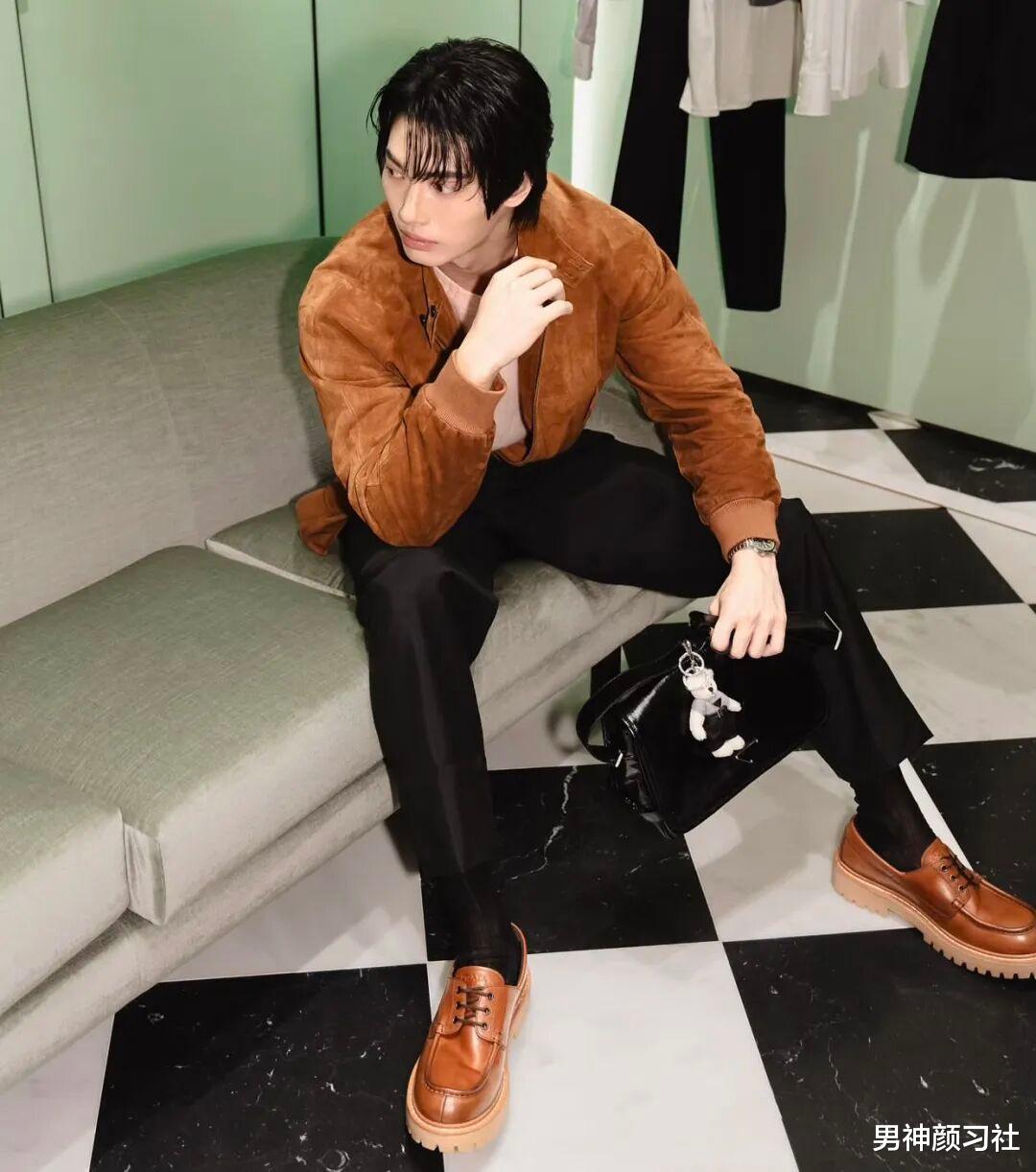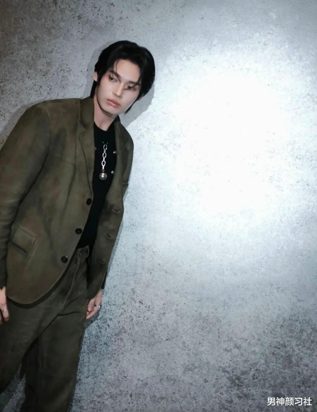 当 Win 穿上西装时,他偏爱那些有做旧感的麂皮或灯芯绒材质。内搭选择黑色基础款毛衣,而点睛之笔在于毛衣上的金属配饰,让沉稳的深色西装造型立刻变得精致且充满时尚光泽。
