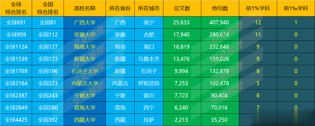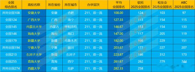 综合来说,在这九所211高校中,有7所可以归属于末流211的范畴,包括:内蒙古大学、海南大学、新疆大学、宁夏大学、石河子大学、青海大学、西藏大学。