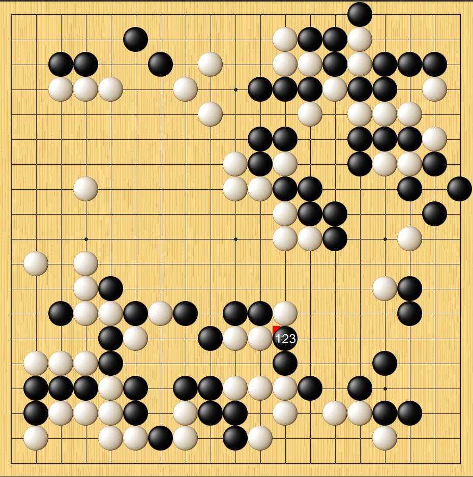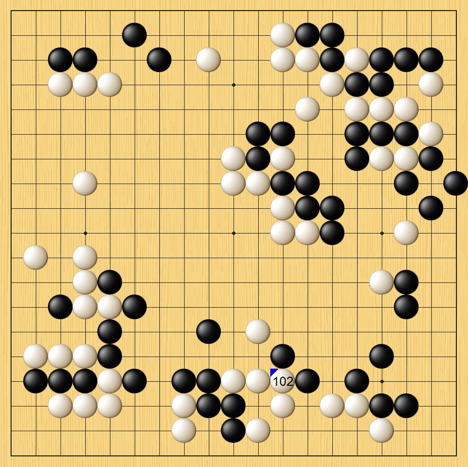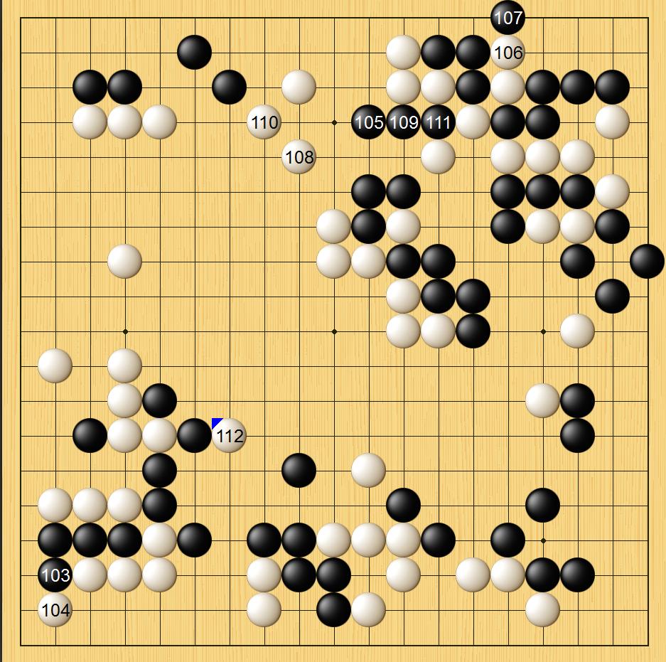 黑棋先是在右上方围起大模样,杨鼎新选择从底线打入破空。但第102手明显有些缓,应该在123右一路跳。
