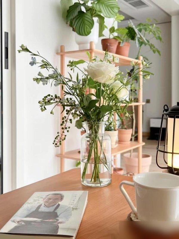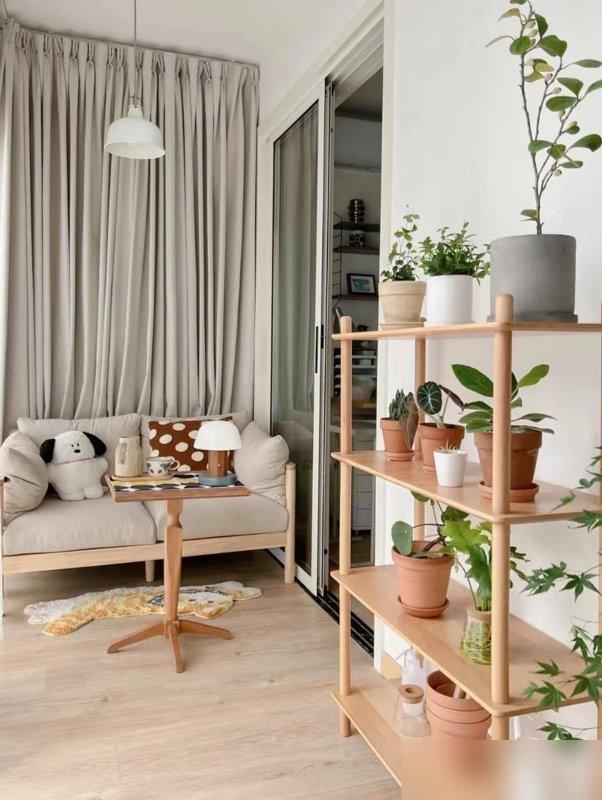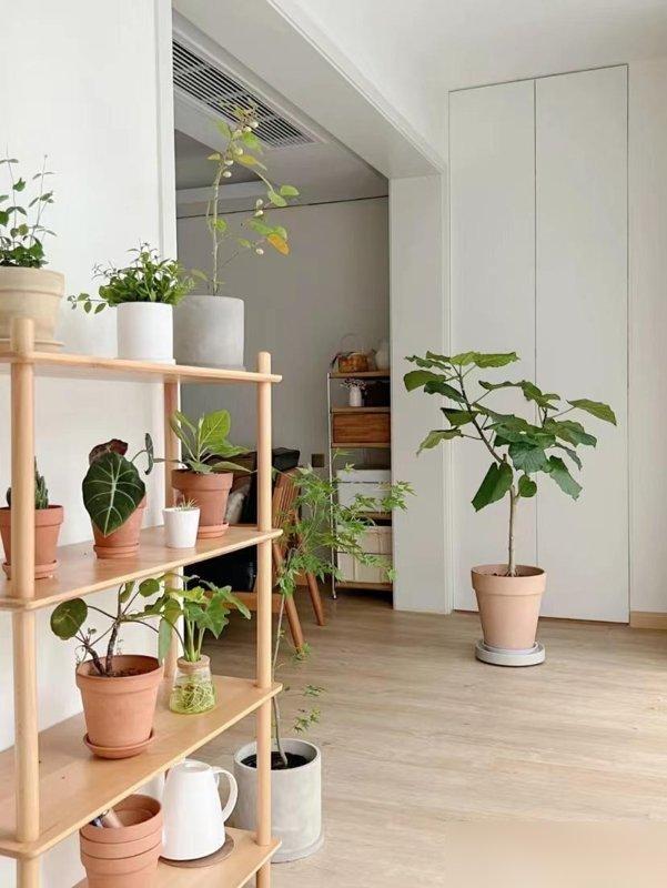 不是为了显空间大, "让太阳光跑得痛快点儿,早上七点儿光裹粉绿萝叶撒进来, 原木地板泛着暖光, 坐沙发上等茶凉的时候,能看见光移动的松影子";玄关不用金属钩?