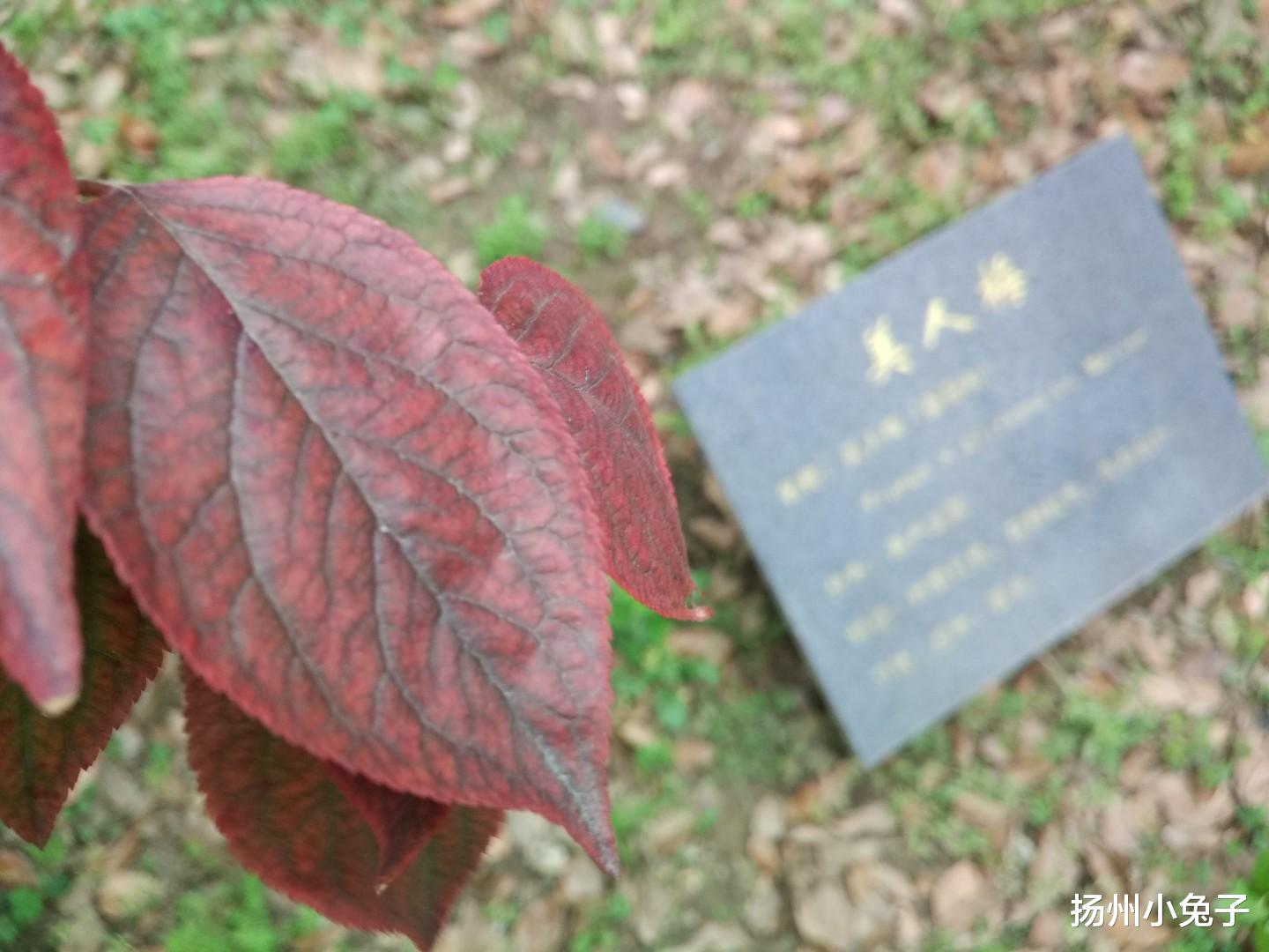 流连欣赏了一会,留下一张永恒的瞬间。随后被临近的晚樱叶惊艳。叶子下垂有点外翻,仿佛就为了展示一样。叶子有淡色的紫,脉络却像人的毛细血管那样,是胜过紫色的红。轻轻托起那片叶子,生怕弄破它的“血管”。原来,不只是人类在老了以后才青筋暴露,植物也会啊。