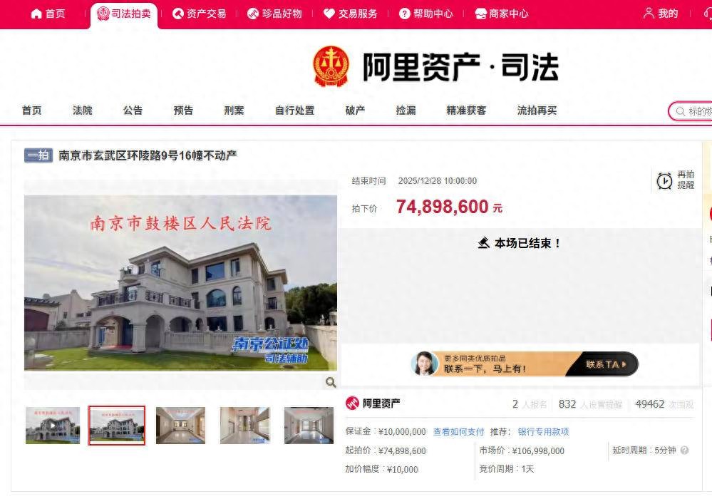 记者获悉,这套别墅的协议价高达1.06998亿元,起拍价定为这一价格的“七折”即7489.86万元,参加拍卖需交纳的保证金高达1000万元。此次拍卖从12月27日上午10点开始,共有2人报名参加,但截至28日上午10点拍卖结束,仅有1人出价,最终这套别墅以起拍价成交。