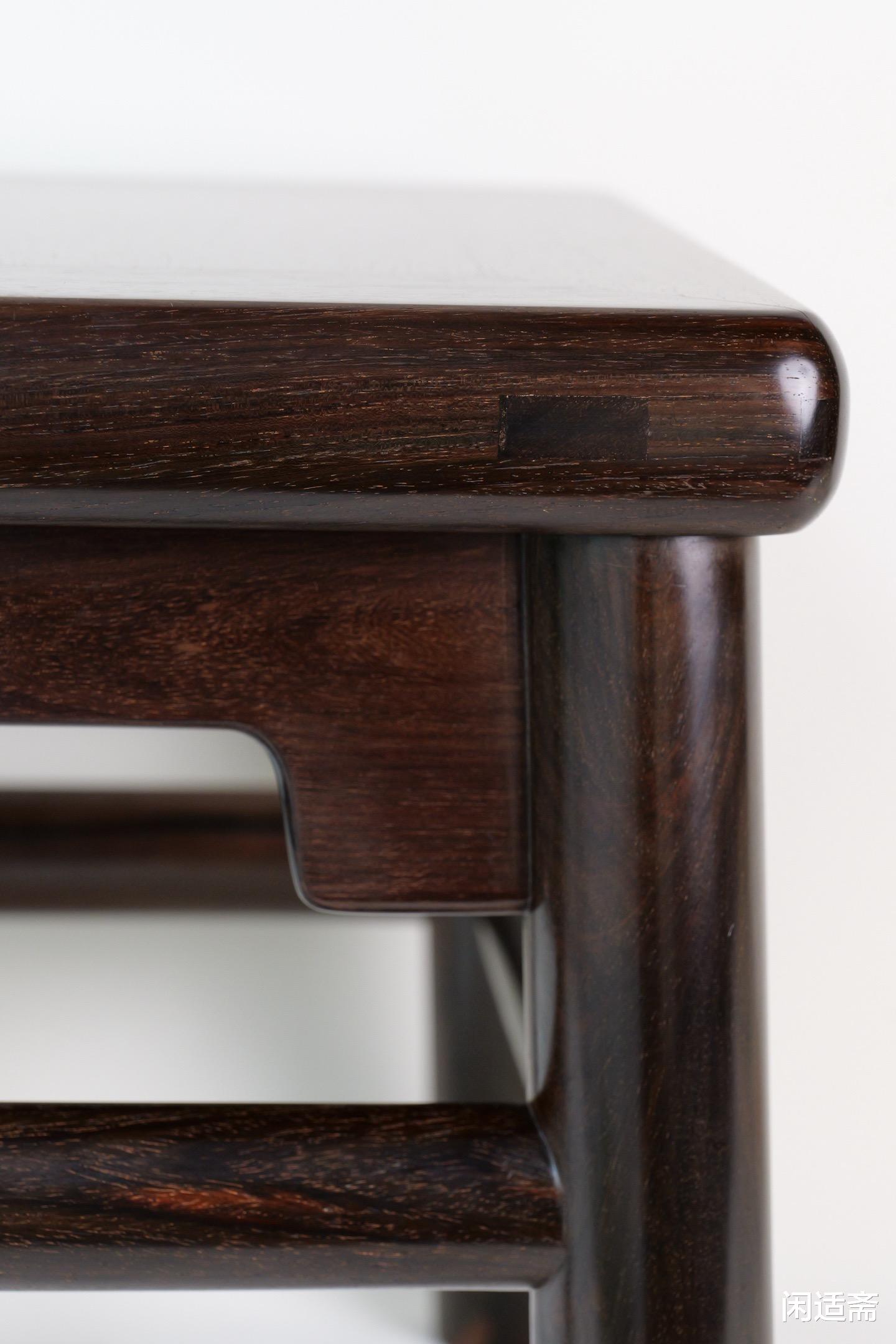 整器采用明式无束腰经典造法,四足圆材直落,侧脚收分自然,尽显沉稳大气。腿足间增设直枨与管脚枨,搭配简洁素净的素牙条,无多余装饰,既保证了整体结构的稳固性,又契合明式“删繁就简”的审美追求,利落又不失雅致。