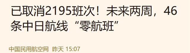 除此之外,航班管家数据显示,截至2025年12月,未来两周内中日之间46条航线“全部暂停”,实现“零航班”。
