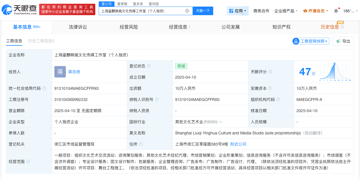 天眼查App显示,上海鎏麒映画文化传媒工作室(个人独资)成立于2025年4月,投资人为蒋志扬,出资额10万人民币,经营范围包括组织文化艺术交流活动、咨询策划服务、其他文化艺术经纪代理等。
