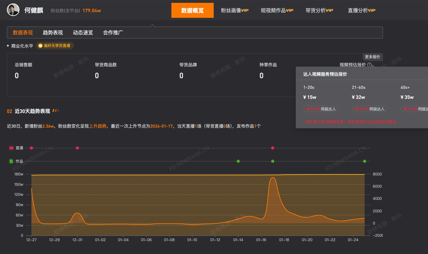第三方数据显示,“何健麒”视频平台账号近30日涨粉2.36万。商业化水平显示,其1-20s、21-60s、60s以上视频广告报价分别为15万、32万、35万。
