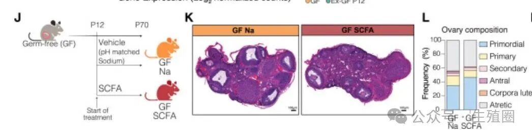 补充了短链脂肪酸的无菌小鼠,卵巢看起来更健康,类似正常小鼠。