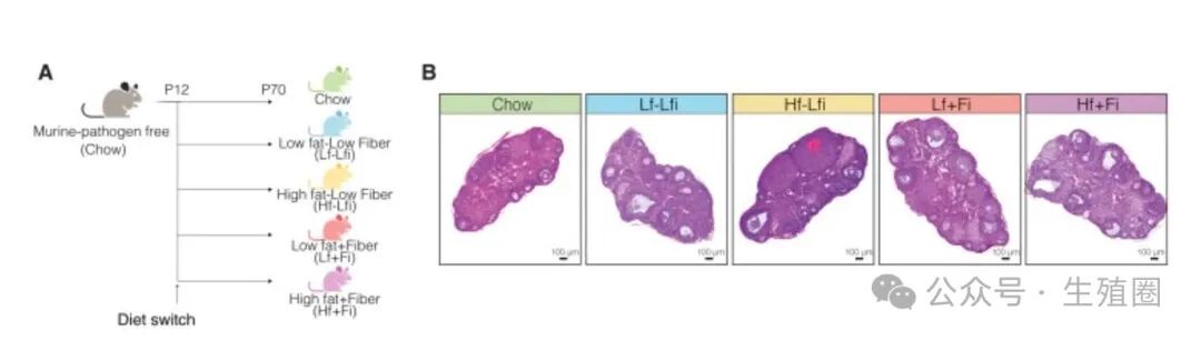 结果发现,最伤卵巢的吃法是高脂+低纤维食物组,吃这个套餐的小鼠,卵巢里卵子库存,也就是原始卵泡数减少了近40%,这是最糟糕的情况。