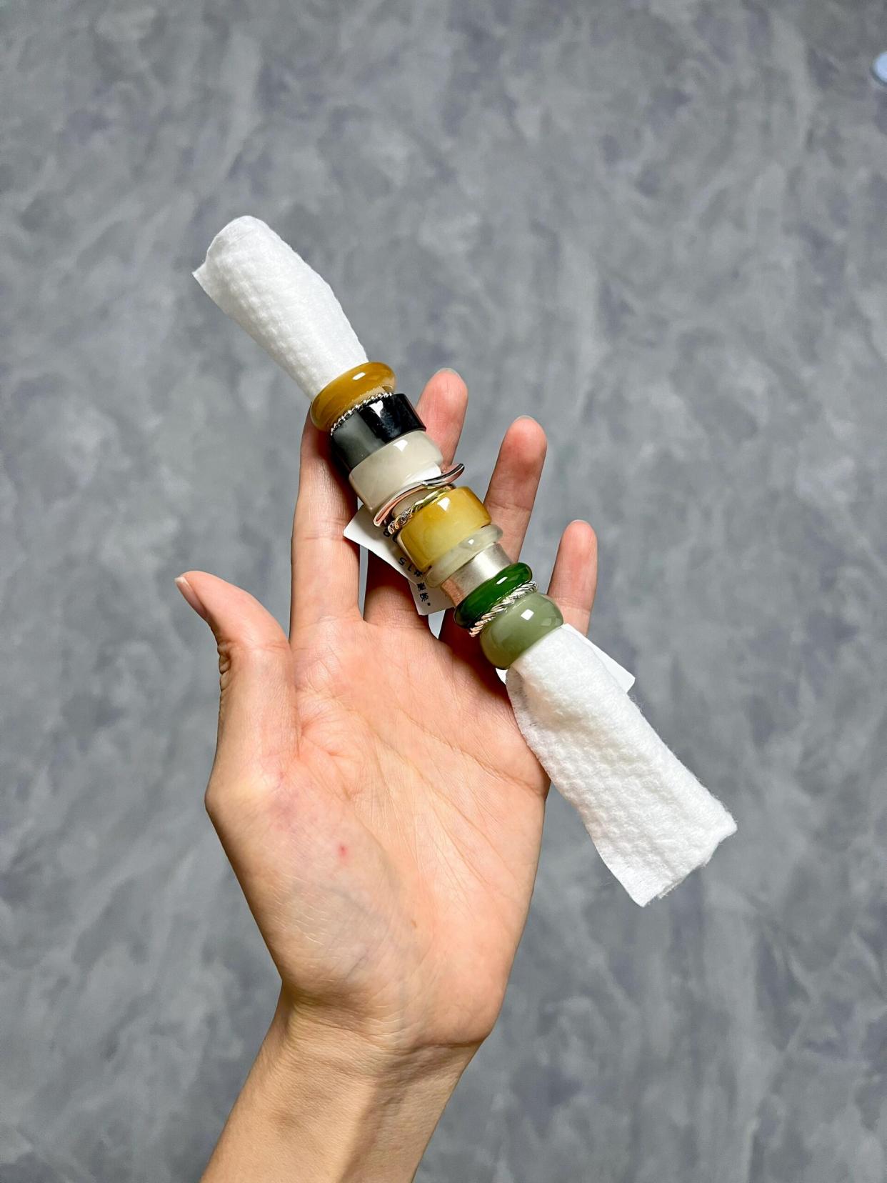 还可以用洗脸巾当收纳棒,把不好收纳的戒指们串起来,是真的省地又安全。