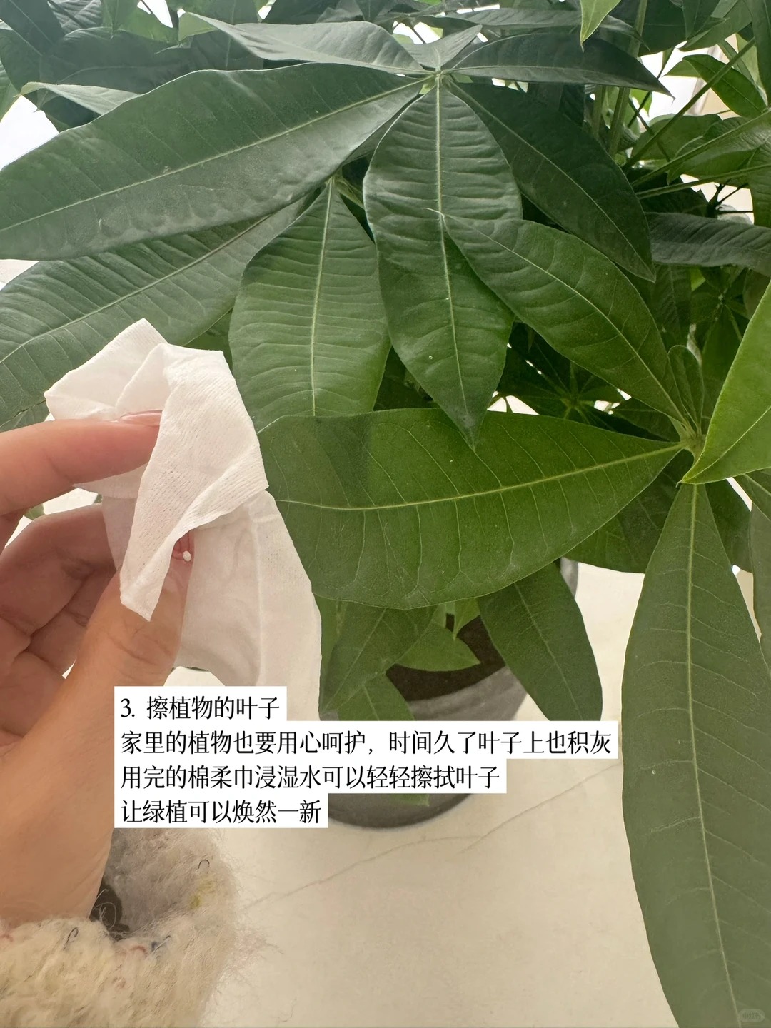 干洗脸巾轻轻擦,能把灰尘掸掉,想擦得更干净,就蘸一点点清水,拧到不滴水,顺着叶片纹路擦,软乎乎的不会刮伤叶片,擦完后绿植叶片亮堂堂的,看着就有生机。