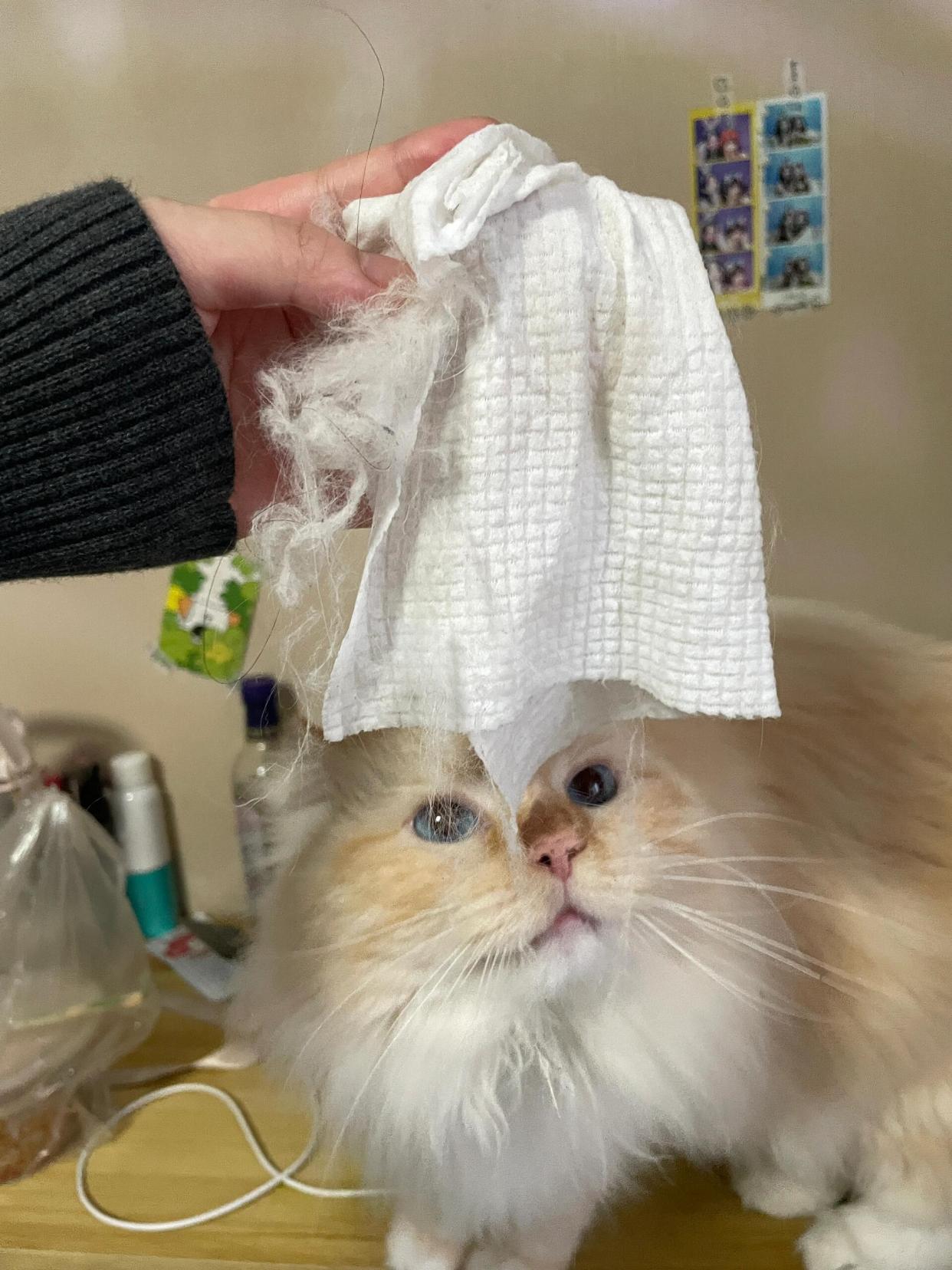 用干洗脸巾擦一擦,毛发会吸附在上面,比专门的粘毛器替换装省钱,效果也还不错,日常清理宠物毛发足够用了。