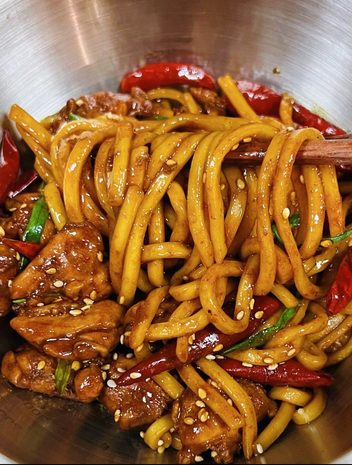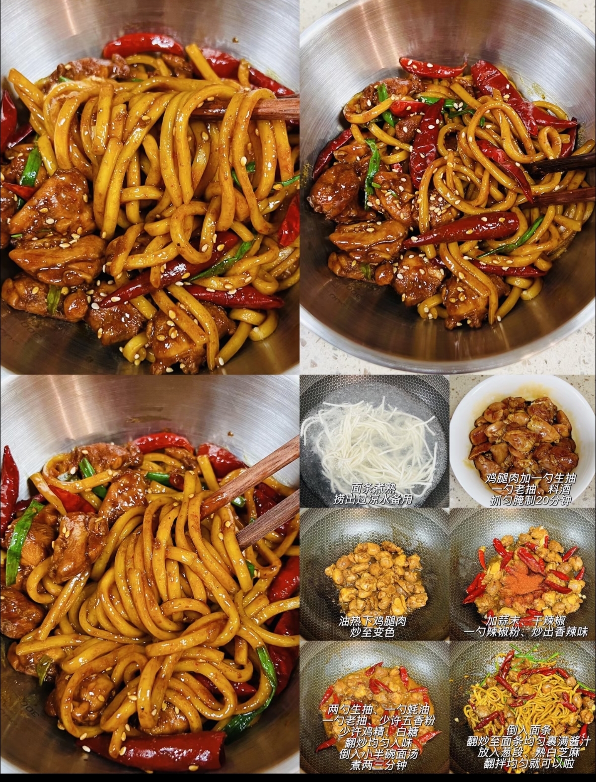 今天做了一碗辣子鸡拌面,刚端上桌,那扑鼻的香气就让人挪不开眼。每一根拉条子面条都粗壮有劲,裹满了红亮诱人的香辣酱汁,咬上一口,先是酱汁的咸香微辣在舌尖炸开,紧接着是面条本身的筋道爽滑,越嚼越香。藏在面条里的鸡肉丁更是点睛之笔,外焦里嫩,吸饱了酱汁的精华,鲜嫩多汁,每一口都是大写的满足。这道菜的做法其实并不复杂,关键在于鸡肉的腌制和酱汁的调配,只要掌握好这两点,你也能在家轻松做出这道让人欲罢不能的美味。下面就让我带你一步步走进这碗面的制作过程,感受家常美食的魅力。