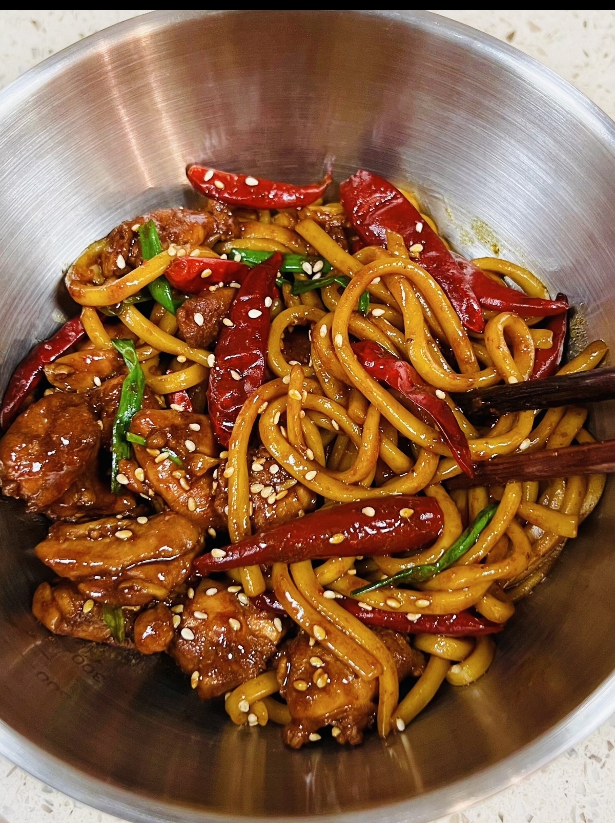 最后,将煮好的面条放入一个大碗中,浇上炒好的辣子鸡和香辣酱汁,撒上一把熟白芝麻和切好的香菜段,用筷子充分拌匀。这一刻,红亮的酱汁、金黄的芝麻、翠绿的香菜与筋道的面条交织在一起,光是看着就让人食指大动。夹起一筷子送入口中,面条的劲道、鸡肉的鲜嫩、酱汁的香辣、芝麻的醇香和香菜的清新在口腔中层层绽放,那种麻辣鲜香的复合味道,让人欲罢不能,一碗接一碗,根本停不下来。
