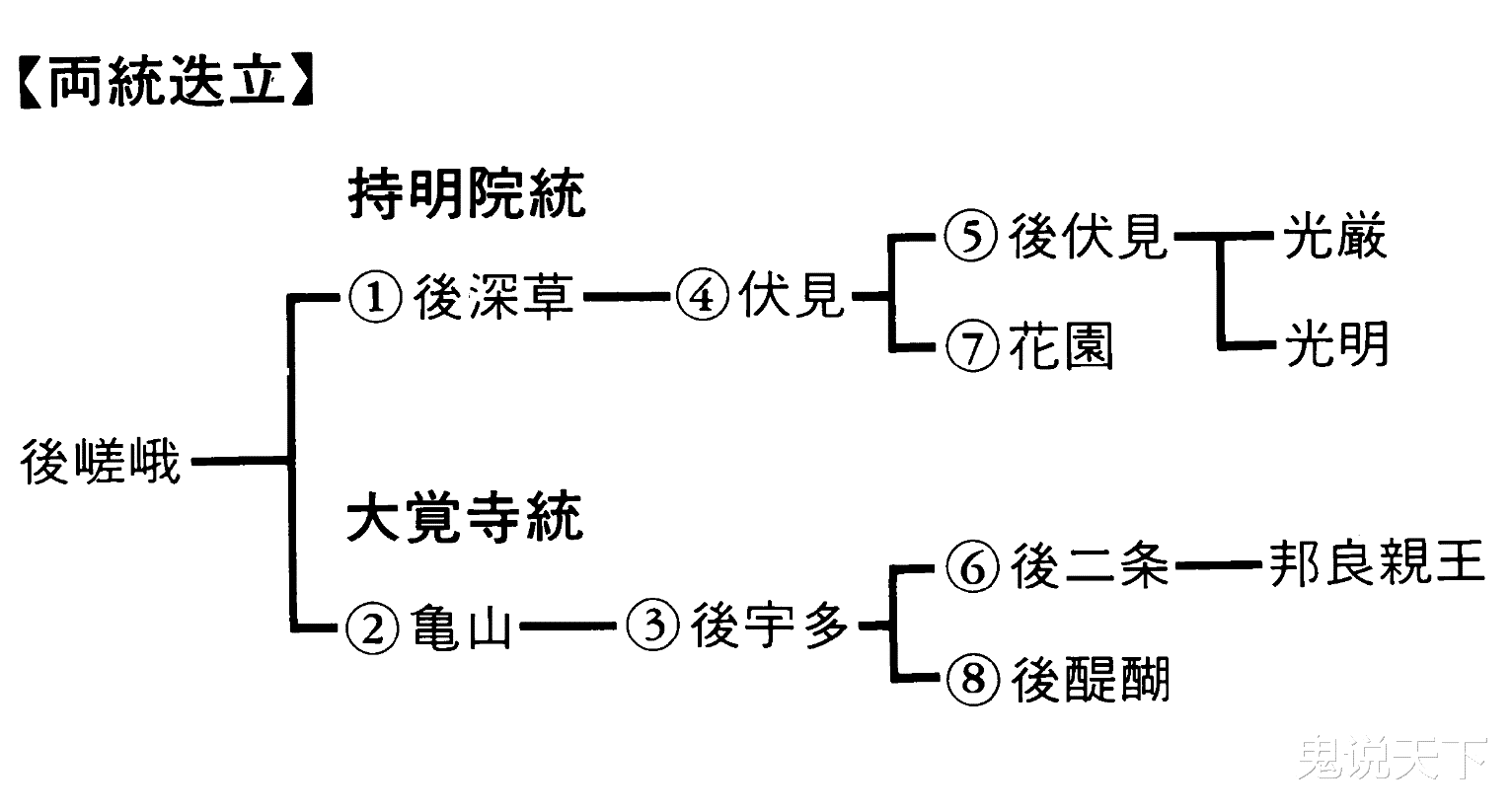 后醍醐天皇是“大觉寺统”,“持明院统”自然不会支持他。更要命的是,后醍醐天皇的父亲、“大觉寺统”的核心天皇后宇多对后醍醐天皇的定位是过渡角色,“大觉寺统”的嫡系继承人是后醍醐天皇的侄子邦良亲王。为了保证邦良亲王继位,后宇多天皇更是公开取消了后醍醐天皇诸子的继承权。