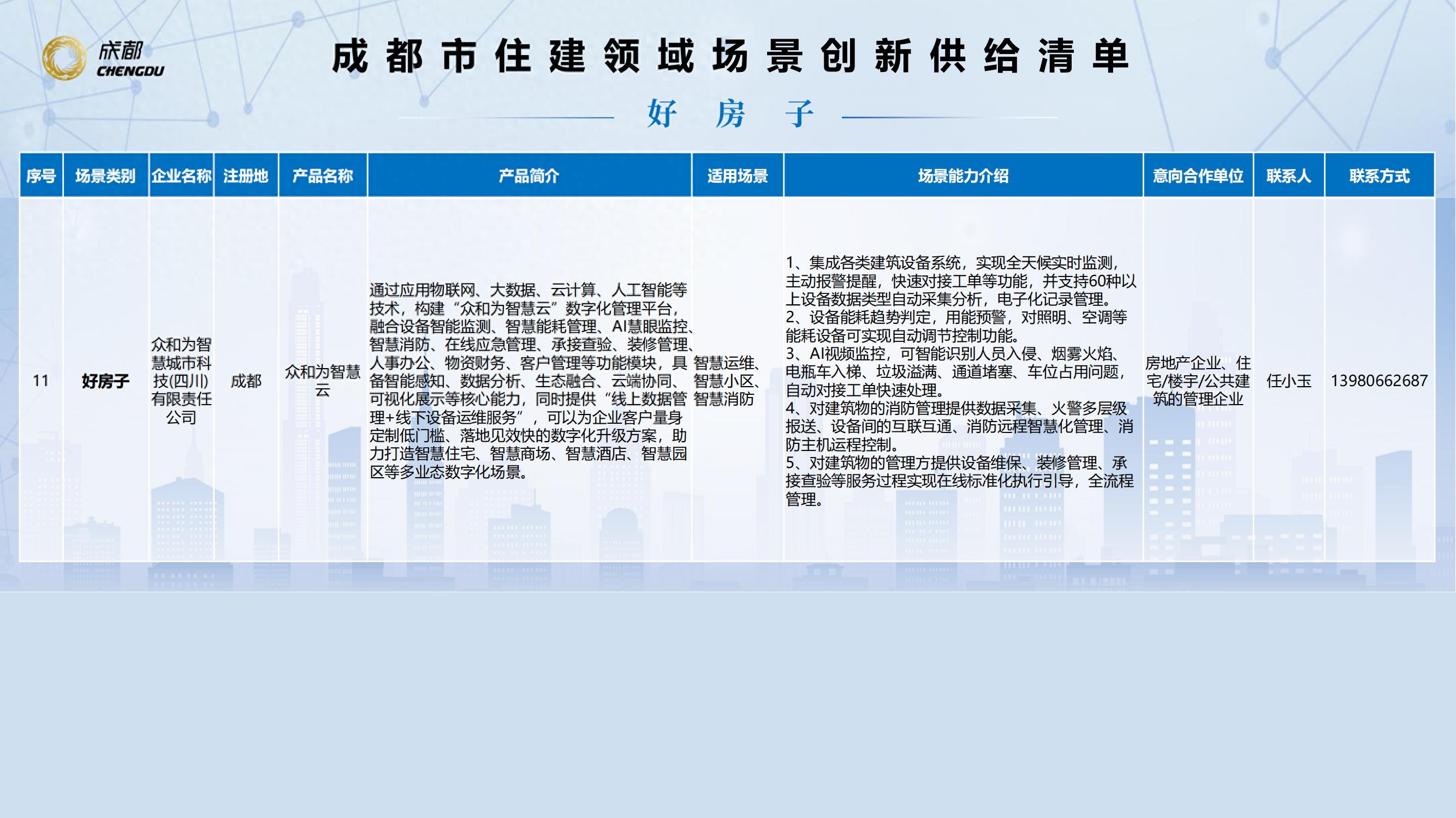 成都市住建局勘设科技处副处长卢睿智在发布清单时介绍,本轮清单更注重场景的专业化与实效性。以入选企业“众和为智慧城市科技”提供的“众和为智慧云”平台为例,其整合了设备智巡、品质管控、节能降耗等18个功能模块,通过数据驱动与AI智能技术,推动物业管理从传统的“硬件运维”向“软件赋能、智能决策”转型,为实现建筑设施设备的精细化、低碳化管理探索了可行路径。