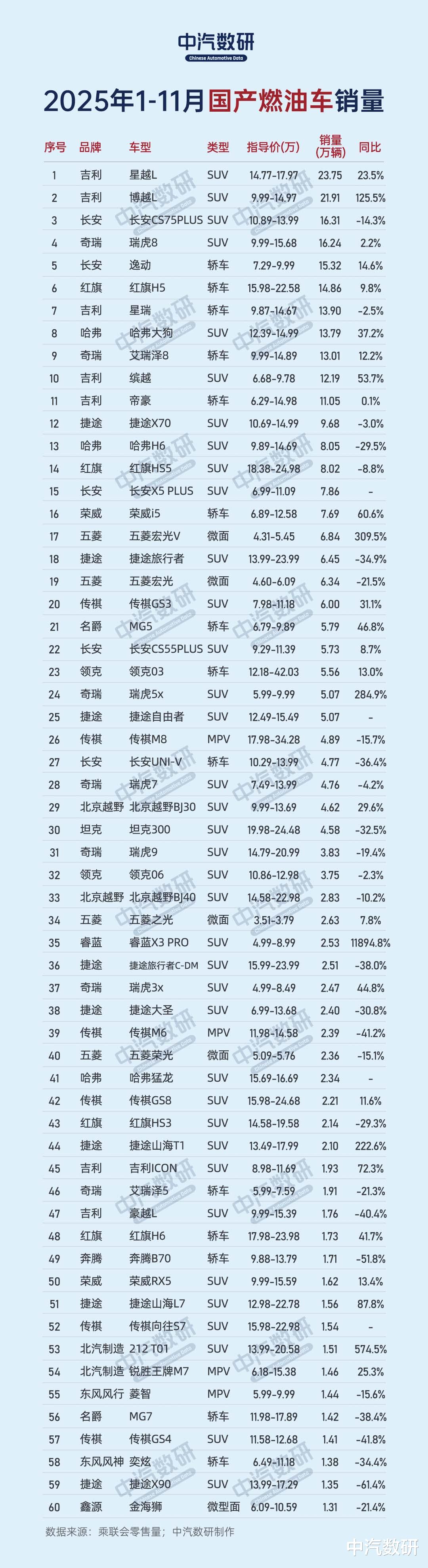 2025年1-11月燃油车销量榜单出炉,整体来看,合资品牌仍握销量主导权,但国产品牌凭下沉市场、中高端突破,正在燃油车市场中撕开缺口。