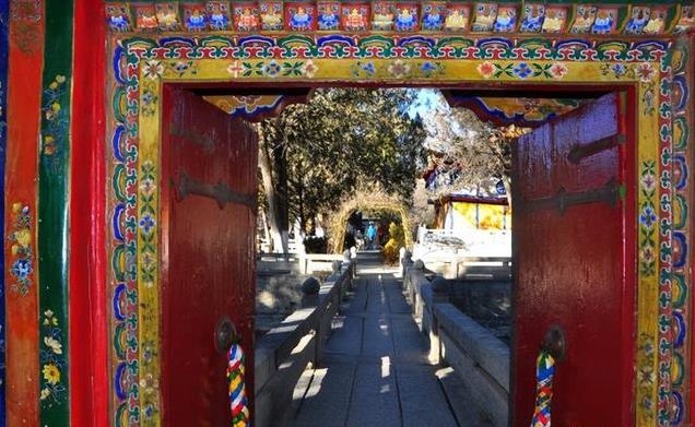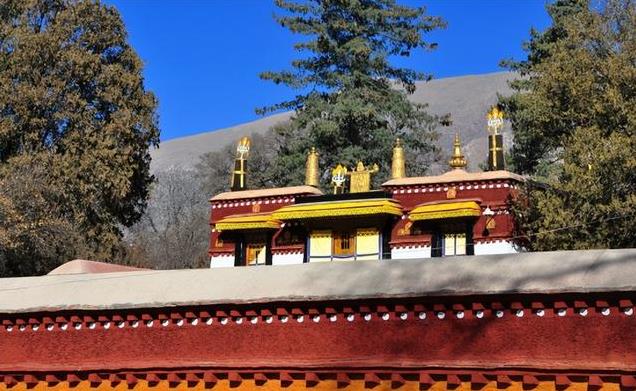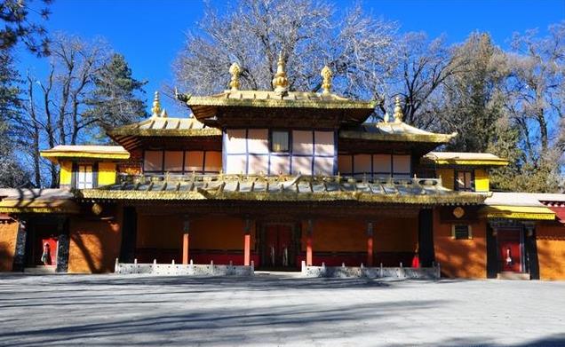 到了1954年,罗布林卡又得到一次较大规模的扩建,主要是修建十四世达赖新宫,叫达颠明久宫。新宫不愧为一座艺术之宫,宫顶有法轮幡幢,金光闪闪,门楼斗拱腾龙飞风,雕刻得栩栩如生。