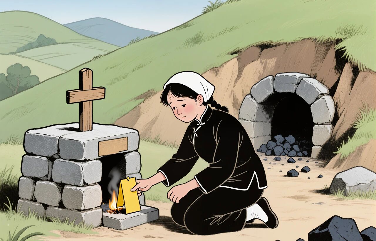 翠兰搂着骨灰盒哭得死去活来。石根见她伤心,也在一旁陪着抹泪。翠兰哭了几天,让石根将骨灰盒埋在那未出煤的窑口旁。石根还为孙福修了座坟,翠兰披麻戴孝,日日跪在坟前烧纸。
