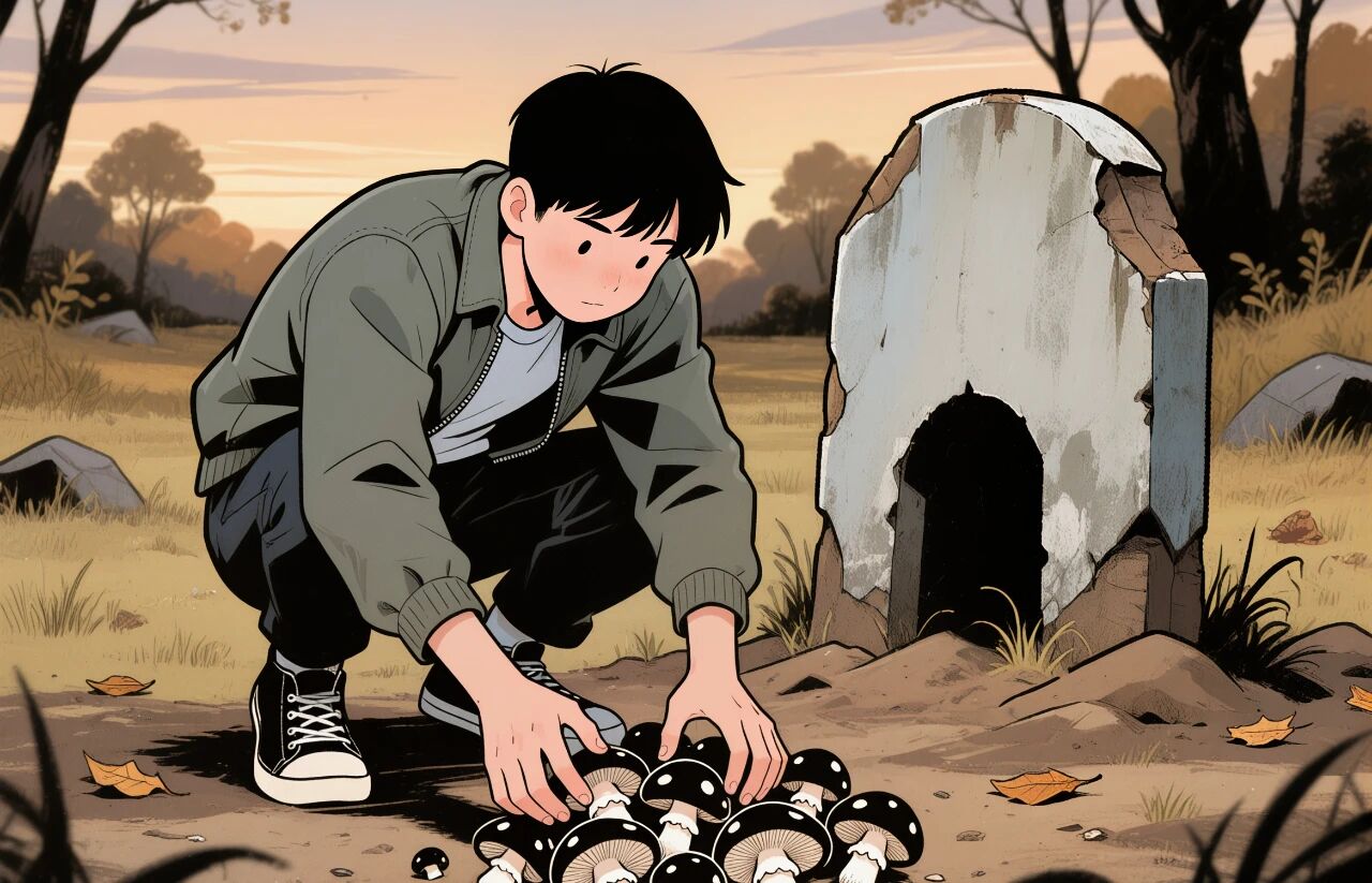 有一天,他在一座荒坟边上见到一片黑蘑菇。