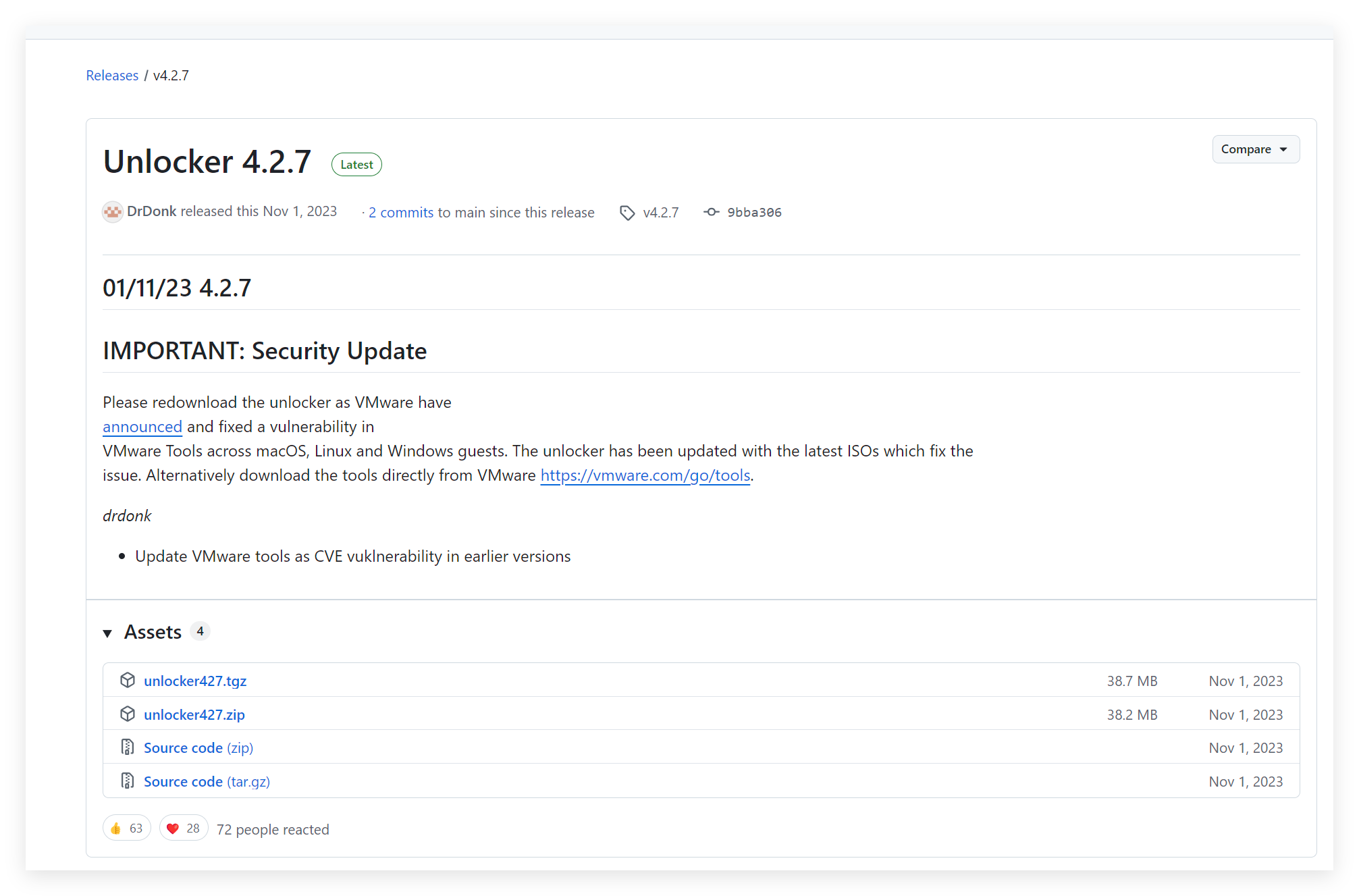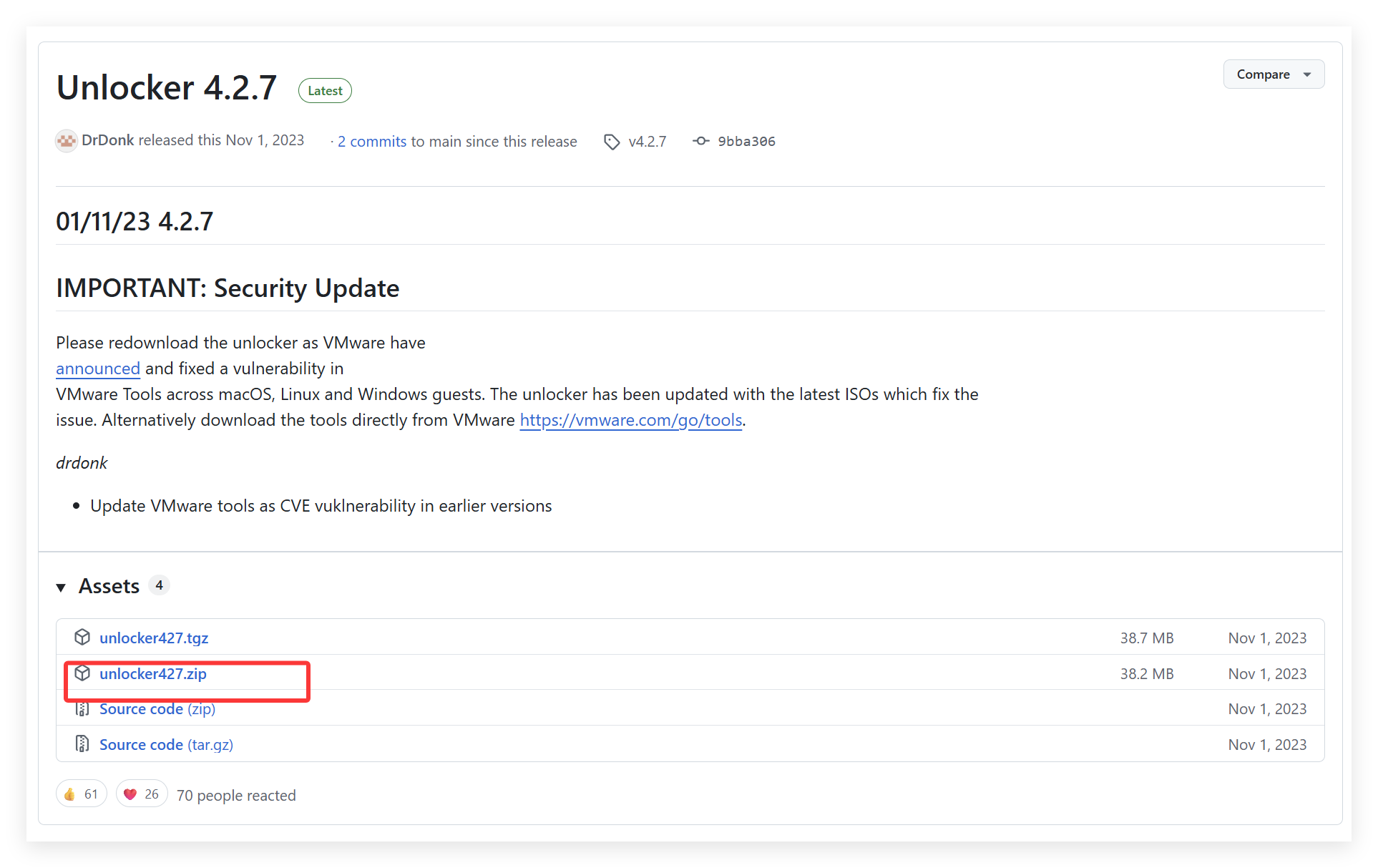 Vmware 默认不会开启开启对 MacOS 的支持,需进行解锁。解锁工具为Unlocker ,其GitHub 托管如下所示: