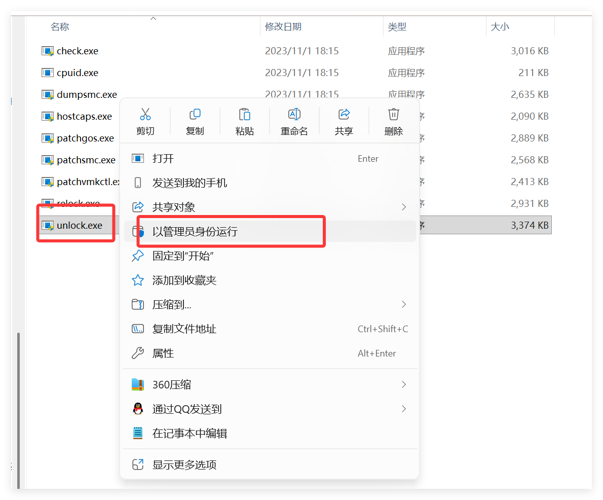 进入 “Windows” 目录,右击“unlock.exe”程序,并选择“以管理员身份运行”: