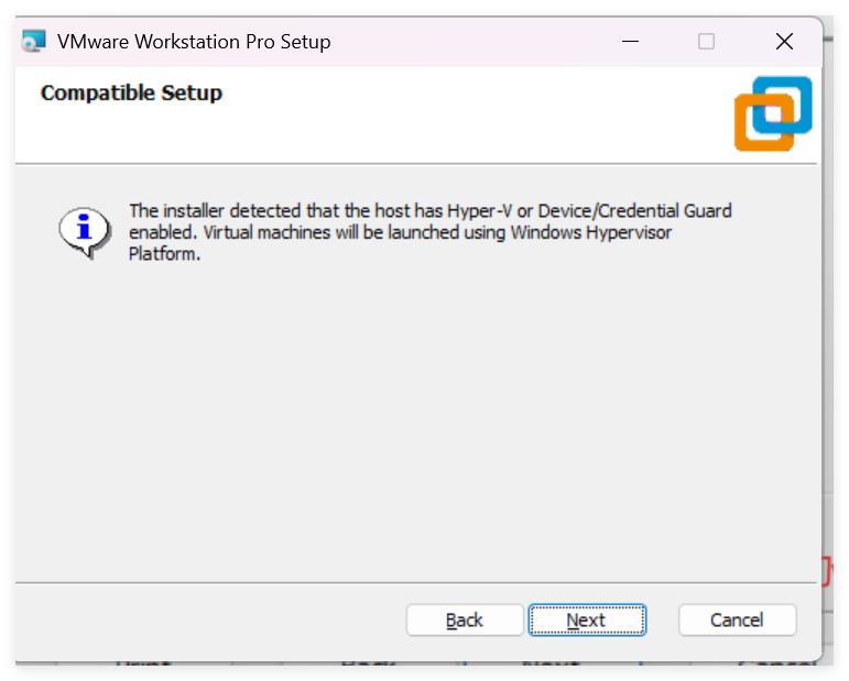 大概意思是,安装程序检测到主机有 Hyper-V 或启用了设备凭证保护,因此虚拟机将在Windows 的hypervisor 平台上运行。当然,这段就是个提示信息,直接点击“Next” 开始配置安装目录: