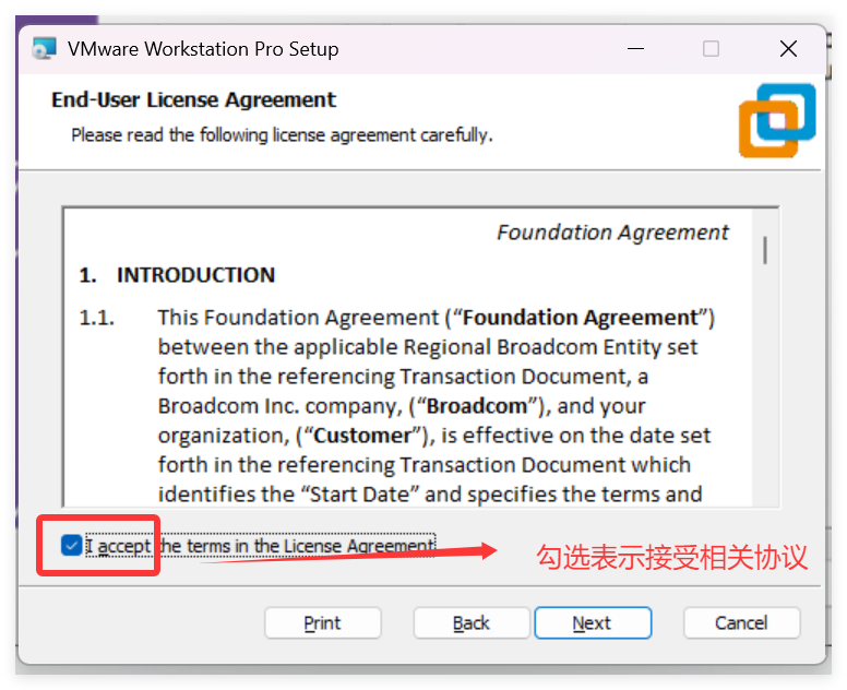点击“Next”后进入如下页面,并勾选下方的复选框,表示接受其相关协议: