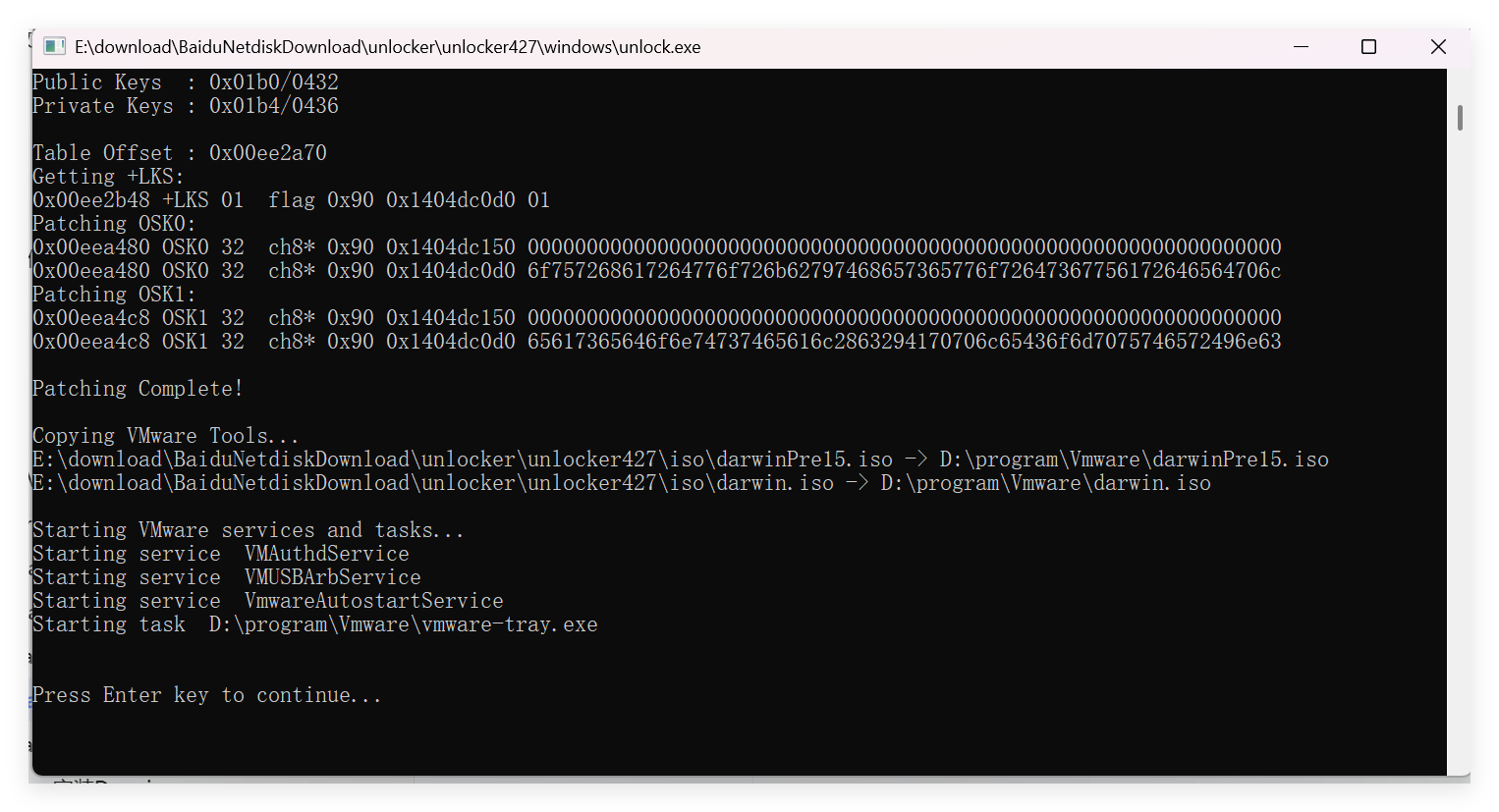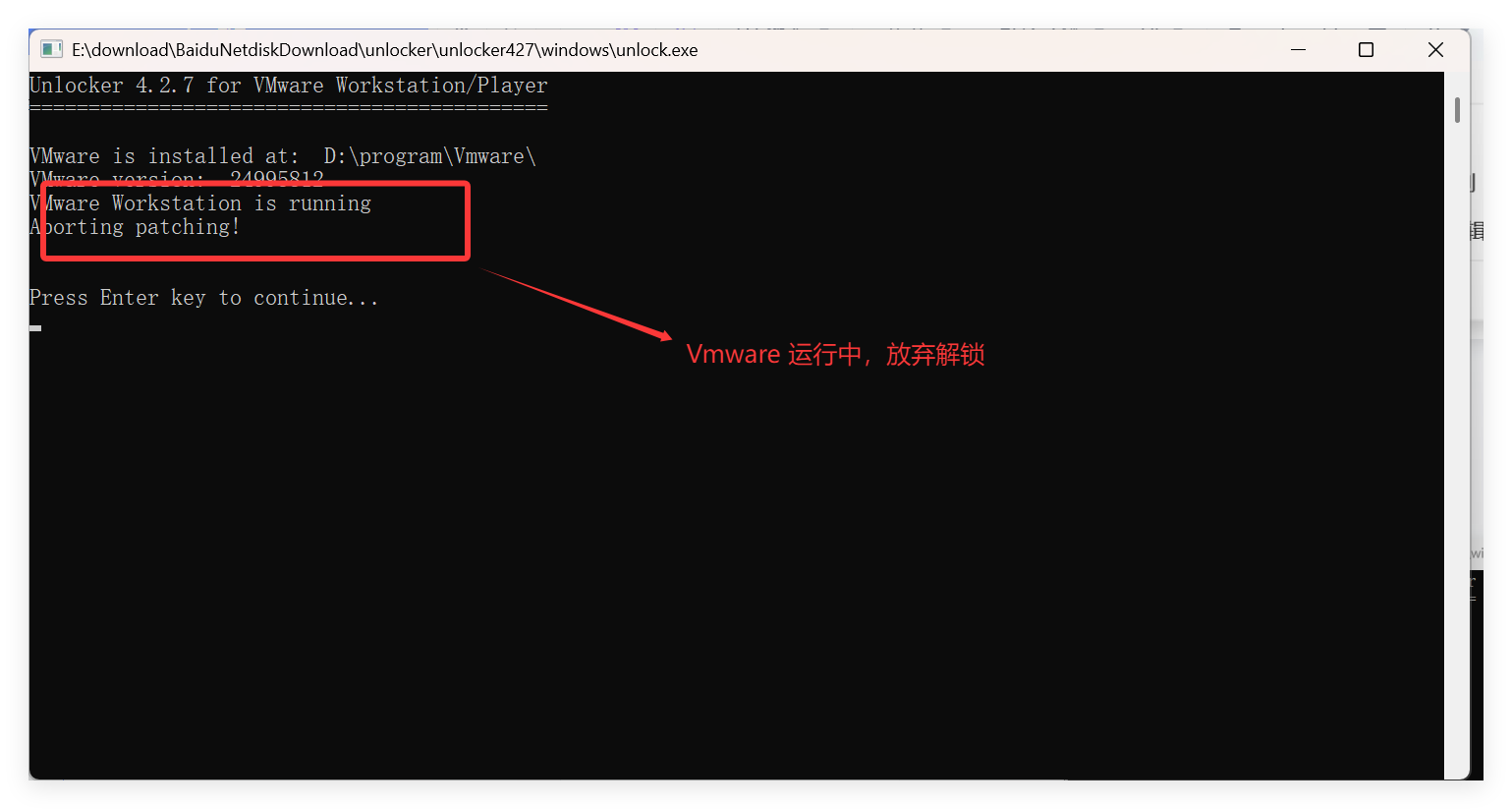 若已打开了 Vmware,则会提示“VMWare Workstation is running, Aborting patching”: