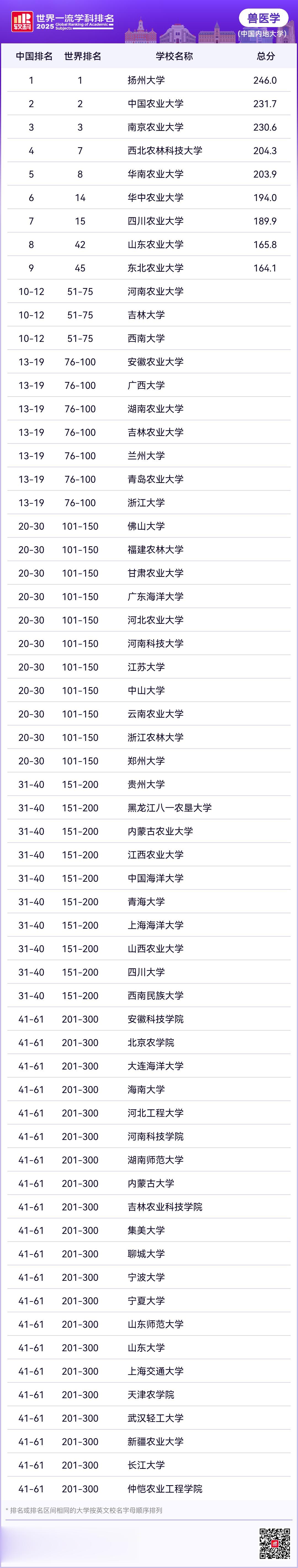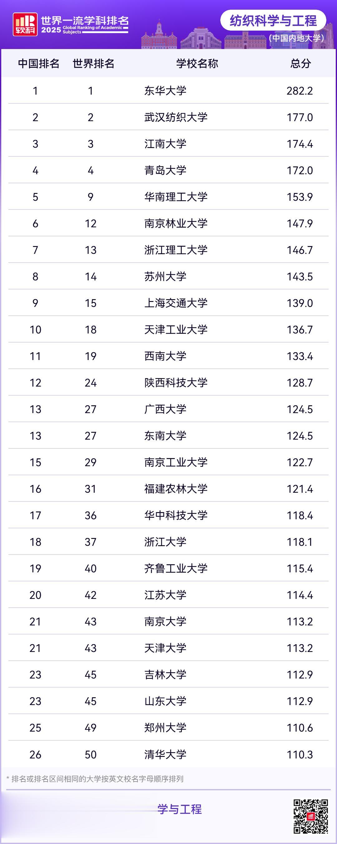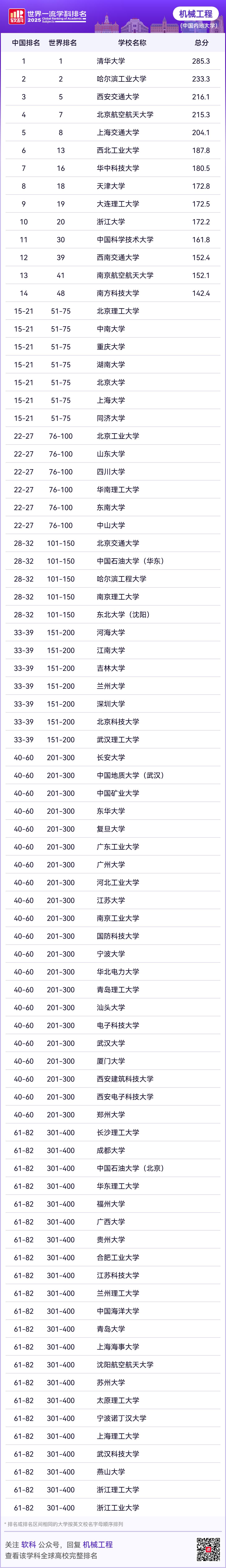 2025软科世界一流学科排名中,中国内地高校在电力电子工程、生物医学工程、材料科学与工程3个学科首度问鼎世界第一,使得中国内地高校的全球冠军学科增加到21个。分别是清华大学(机械工程、电力电子工程、化学工程、材料科学与工程、纳米科学与技术、能源科学与工程、环境科学与工程)、上海交通大学(生物医学工程、船舶与海洋工程)、东南大学(通信工程)、哈尔滨工业大学(仪器科学)、同济大学(土木工程)、河海大学(水资源工程)、江南大学(食品科学与工程)、北京航空航天大学(航空航天工程)、武汉大学(遥感技术)、中南大学(矿业工程)、北京科技大学(冶金工程)、东华大学(纺织科学与工程)、中国农业大学(农学)、扬州大学(兽医学)。其中,扬州大学首次拥有全球冠军学科。