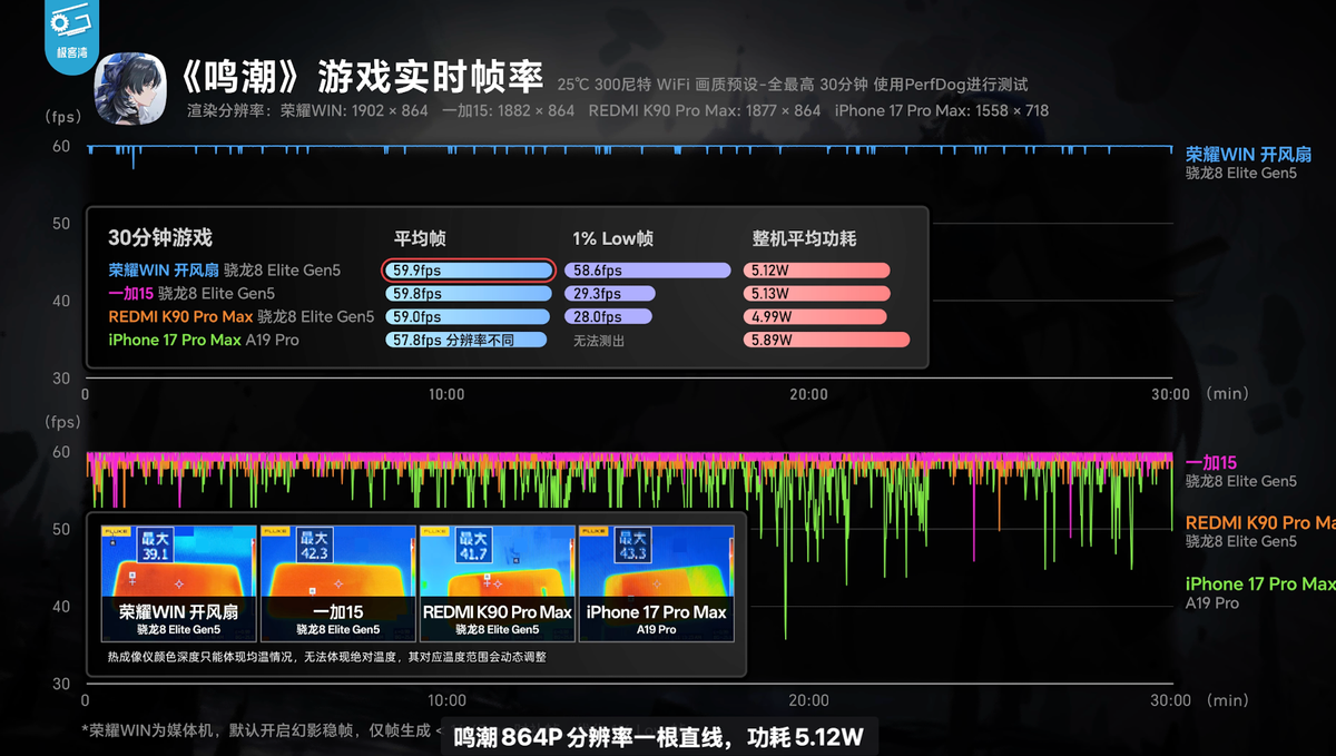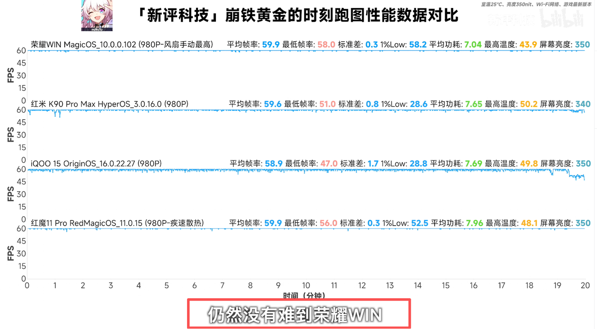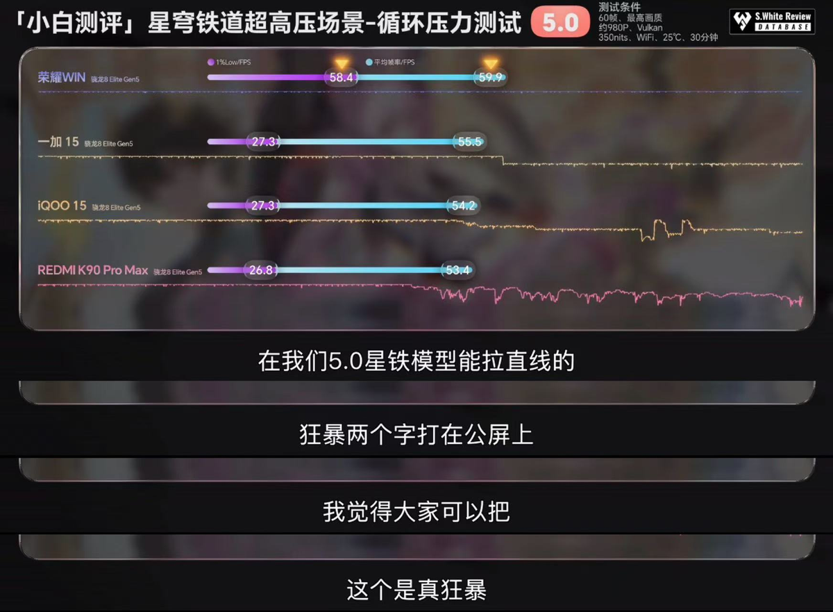 在各大媒体的实测中,荣耀WIN系列的性能表现堪称惊艳。小白测评的测试显示,从《王者荣耀》100分钟超长测试、《和平精英》30分钟复杂场景测试,到《原神》高压复杂场景稳定性测试,甚至《崩坏:星穹铁道》30分钟最高压循环压力测试,荣耀WIN的1% Low帧几近满帧输出,帧率曲线全部呈现一条直线。可以说,荣耀WIN的游戏表现能够吃透所有手游。