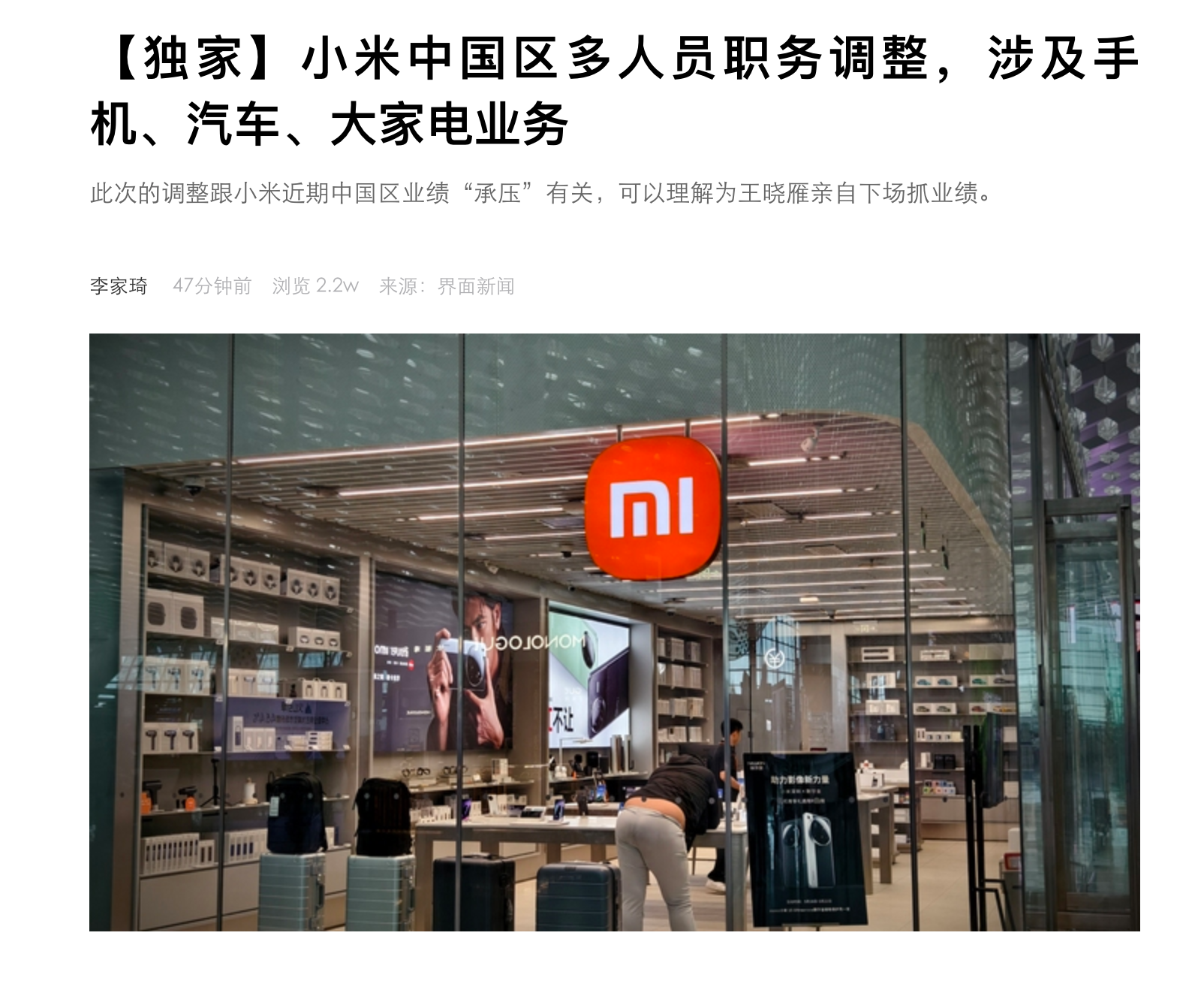 据悉,小米中国区此次大规模人事与渠道优化调整源于小米中国区业绩承压,外部环境导致手机、汽车、大家电订单增长放缓,部分品类出现库存压力。截至发稿,小米方面暂未回应相关调整。