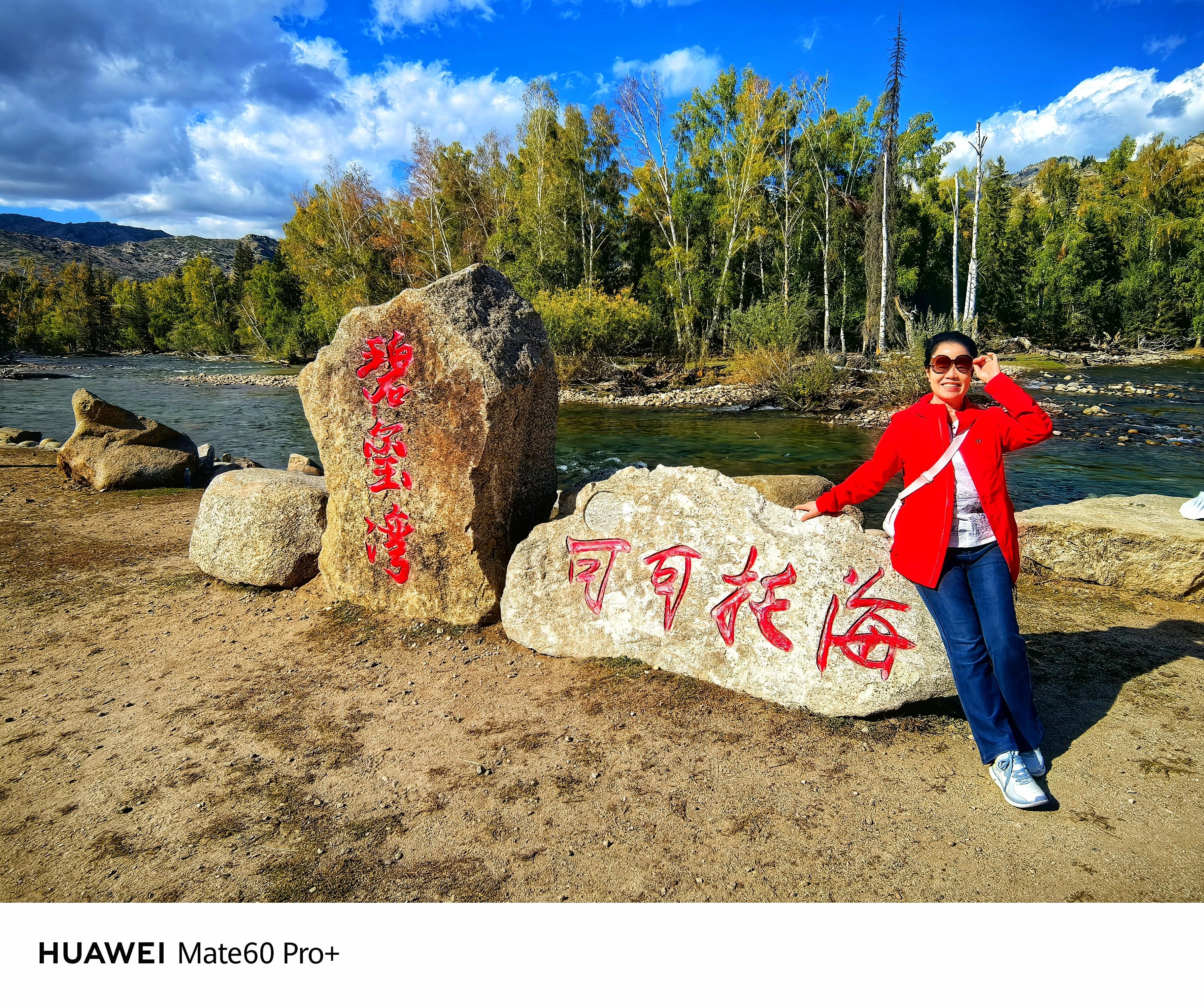 在可可托海碧玺湾,时光仿佛放慢了脚步。那镌刻着“碧玺湾”与“可可托海”的巨石,静静伫立在河畔,似是岁月的守望者,见证着这片土地的变迁与美好。老伴儿身着鲜艳的红衣,站在石旁,阳光洒下,影子被拉得悠长 。背后,河水潺潺,树木在微风中轻舞,每一片叶子都似在诉说着自然的低语。是白桦林,和我们在内蒙的坝上看到的白桦树一样。不过,2019年我们去坝上时,是九月底,有些晚了。但坝上草原的辽阔与这里相比更像秋天。我现在还能清晰的记得,坝上的白桦树叶子的色彩,简直让人无法用语言描述。