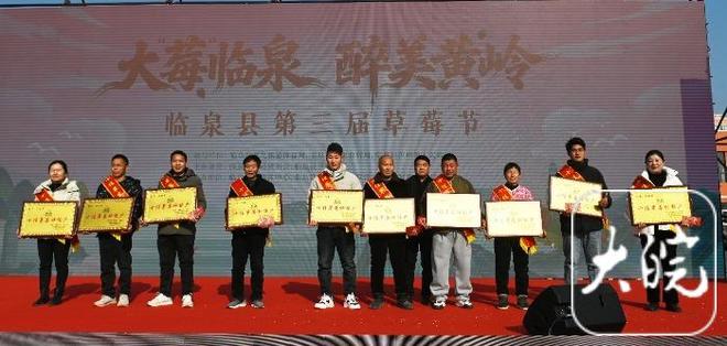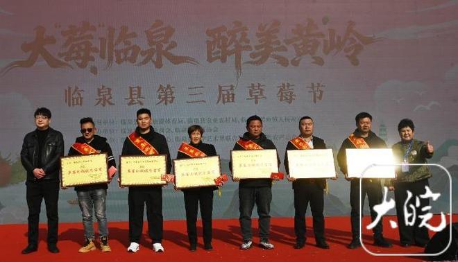 草莓节开幕式上,临泉县十佳草莓种植大户、临泉县草莓购销优质客商被请上主席台,接受奖金和奖牌。