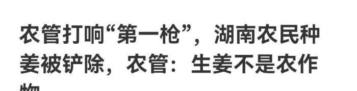 一些农民种植生姜,却被农管部门铲除。农管部门称,生姜不是农作物,不允许种植。这一事件引起了广泛的关注和讨论。