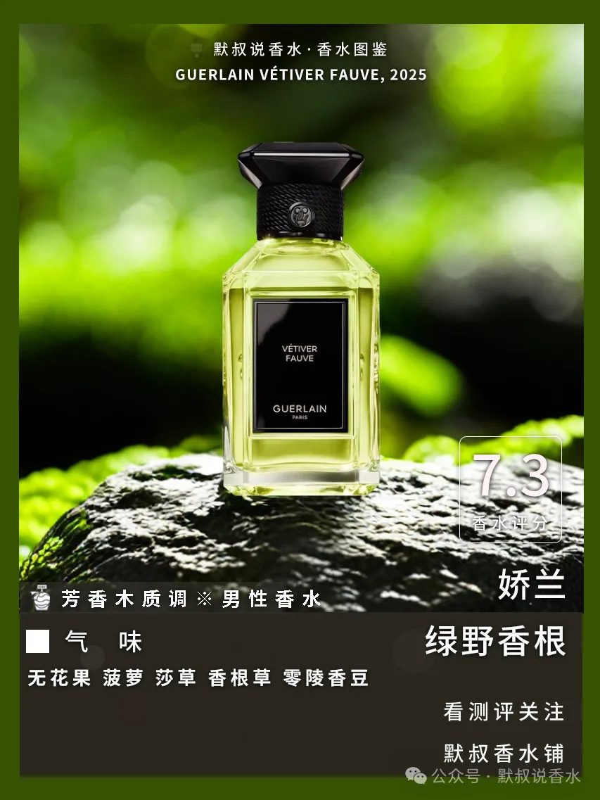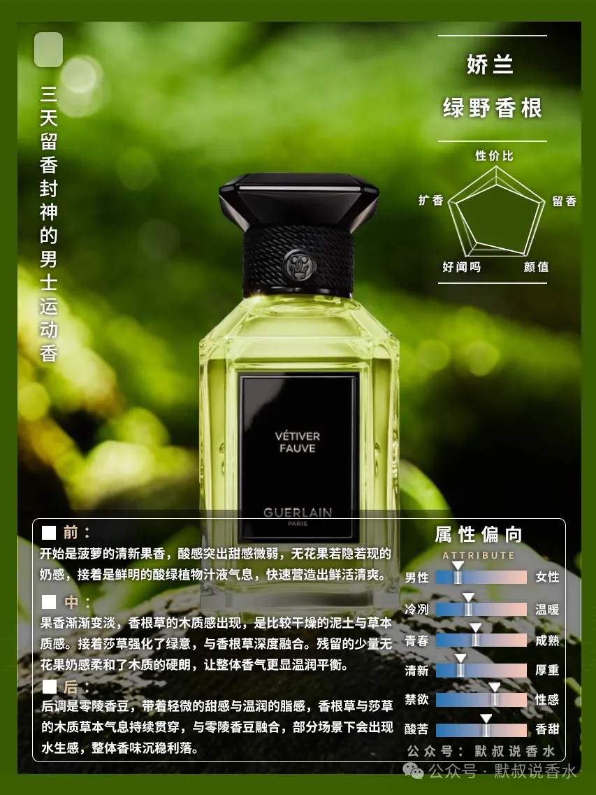 这款娇兰艺术沙龙系列男性芳香木质调新作,以清新绿意香根草为核心,走大众适配的实穿路线,留香与扩散表现出色,但风格偏向商业通俗,缺乏沙龙线应有的深度与人文情怀,口碑两极分化明显。