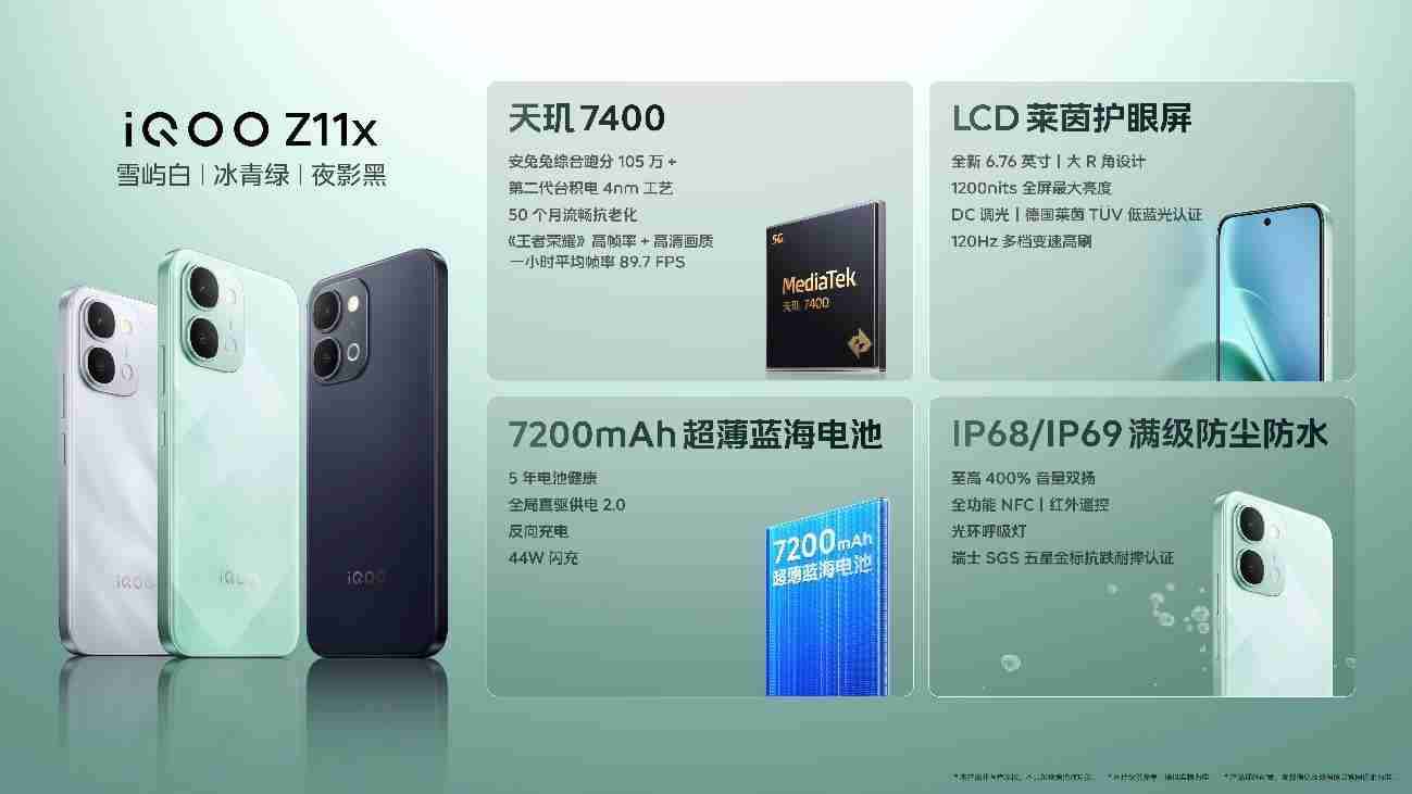 iQOO Z11x 同场亮相,主打 LCD 长续航护眼,具备“冰青绿”、“雪屿白”和“夜影黑”三款配色,采用大 R 角设计,外观优雅,握持舒适。