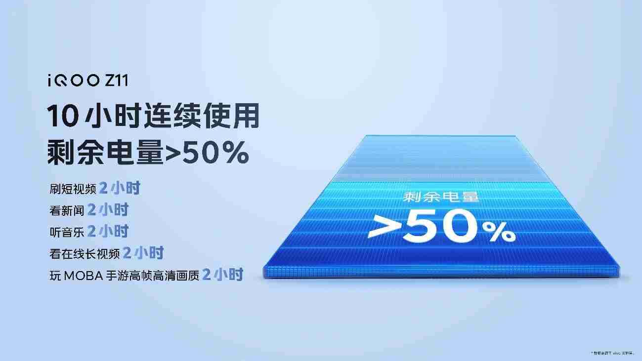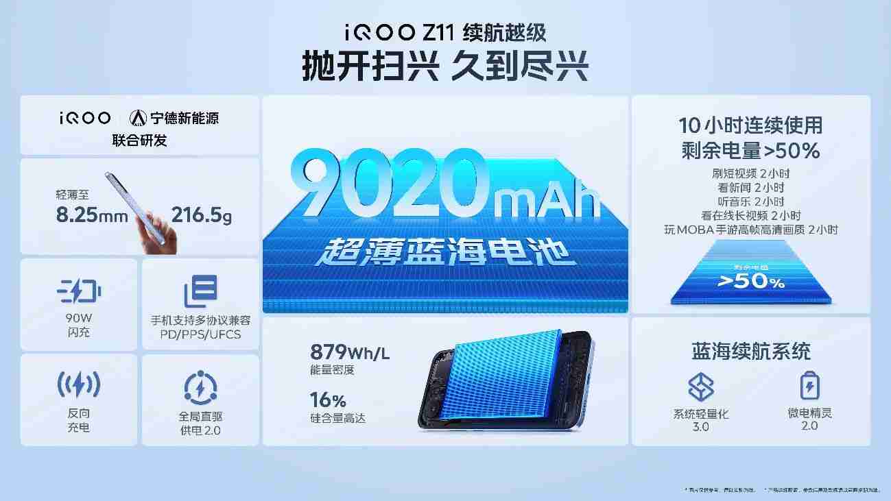 iQOO Z11 搭载 iQOO 史上最大的 9020mAh 超薄蓝海电池,采用与宁德新能源联合研发,具备硅含量高达 16% 的全新第四代硅负极,以及能够实现低温持久续航的全新第二代半固态技术,能量密度突破 879Wh/L,续航实力轻松爆表。全新蓝海续航系统拥有微电精灵 2.0 和系统轻量化 3.0,不但待机功耗更低,还能凭借疾速满血复活功能,电量接近耗尽时插电即恢复游戏原界面,关键时刻绝不慌神。