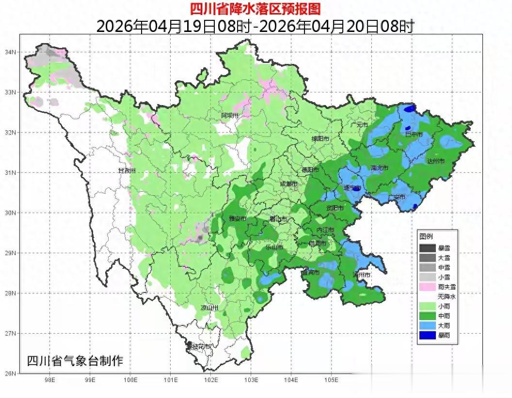 2. 甘孜南部、凉山西部18日有雨(雪),高海拔区域注意防滑、保暖,攀西地区19日中到大雨区域需防范地质灾害;