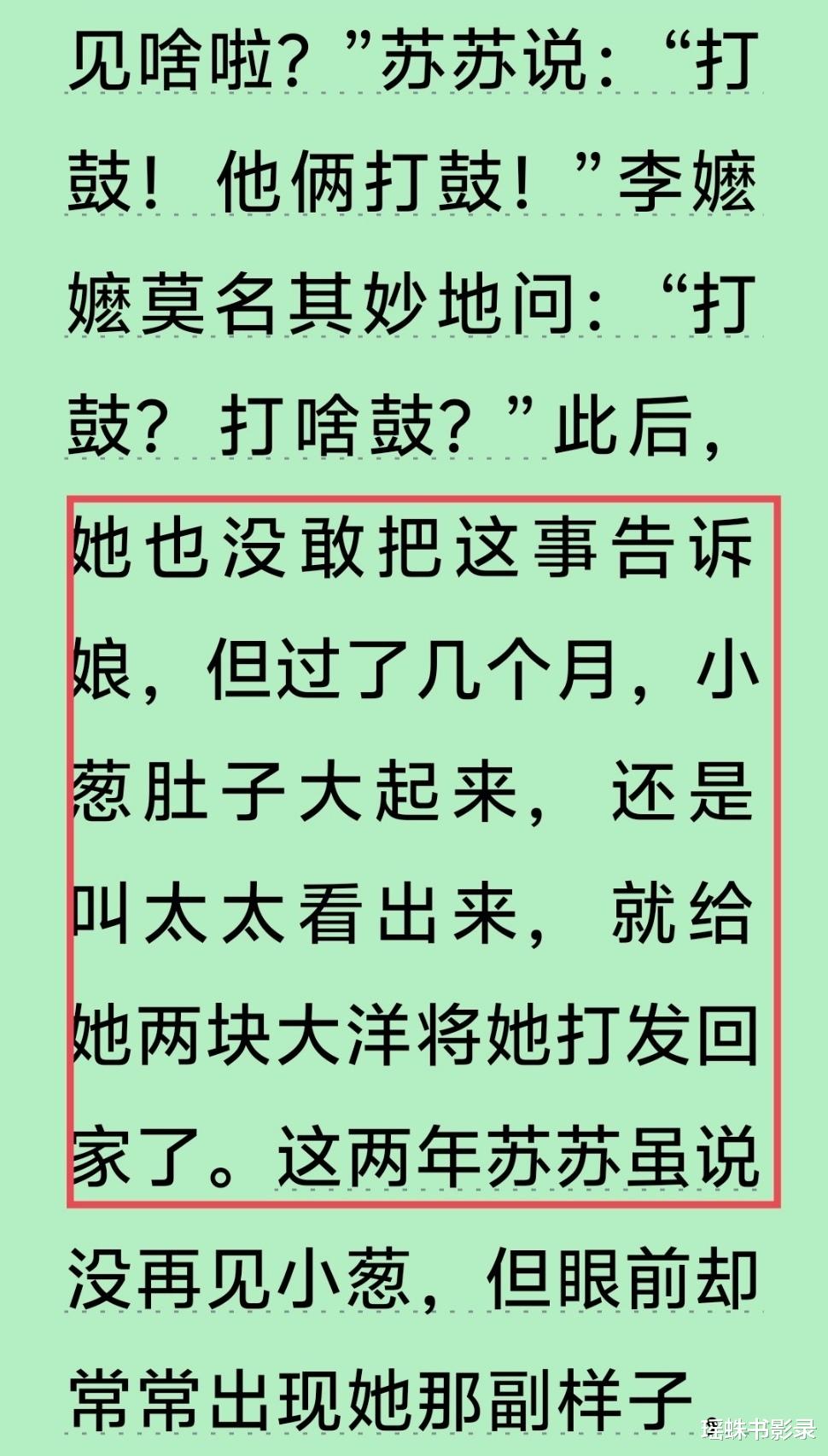 直到几个月后,小葱的肚子大了起来,被她娘给看出来了,随手给了两块大洋,就给打发回家了。