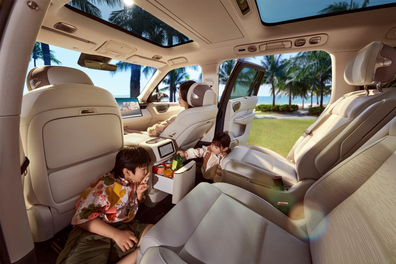 二排设计灵活多变:双180°电动旋转座椅结合超长滑移行程,孩子可以面对面玩耍,父母可以交流,累了还可躺下小憩。车内配置全面覆盖家庭场景:冷暖车载冰箱、侧窗隐私遮阳帘、30英寸6K双巨幕及四音区独立音响,让每次出行都更加舒适实用。领克900以细致入微的空间优化,让家庭用车体验更轻松。