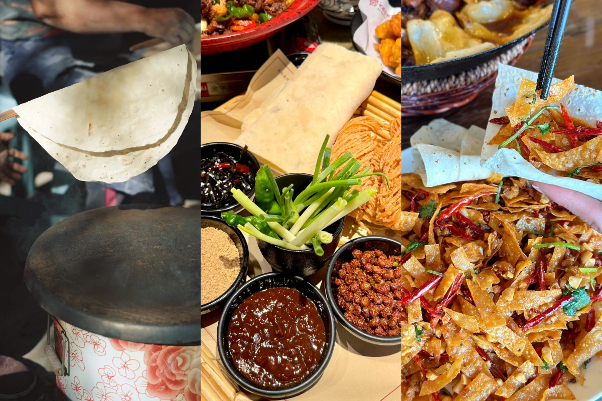 一张烙馍,包容万千:卷上酥脆馓子、爽口小菜,是地道“中式塔可”;裹着热腾腾的地锅鸡、辣椒炒小鱼,吸饱汤汁风味绝佳;切丝油炸再卷入整张烙馍,便是本地名吃“烙馍卷烙馍”。