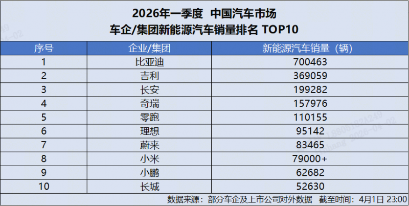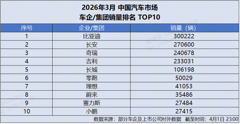 4 月 1 日,比亚迪发布 2026 年 3 月产销数据,单月总销量达300222 辆,强势突破 30 万辆大关,再添荣