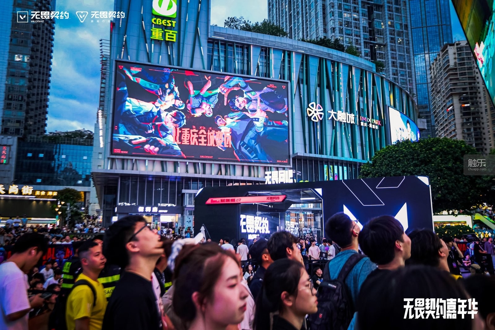 不久后,站在重庆最繁华的商圈之一——观音桥步行街中央时,我清晰地感受到,经过2年生态与潮流文化的积累,《无畏契约》2周年嘉年华已经超过了以往所有“瓦”线下活动的规模。电竞、派对、音乐、表演、打卡等丰富的内容覆盖了整个城市,正如官方“重庆全城一起变瓦”的口号那样,《无畏契约》正在用自己的潮流文化底蕴,与这座城市产生一些特别的交融与碰撞。