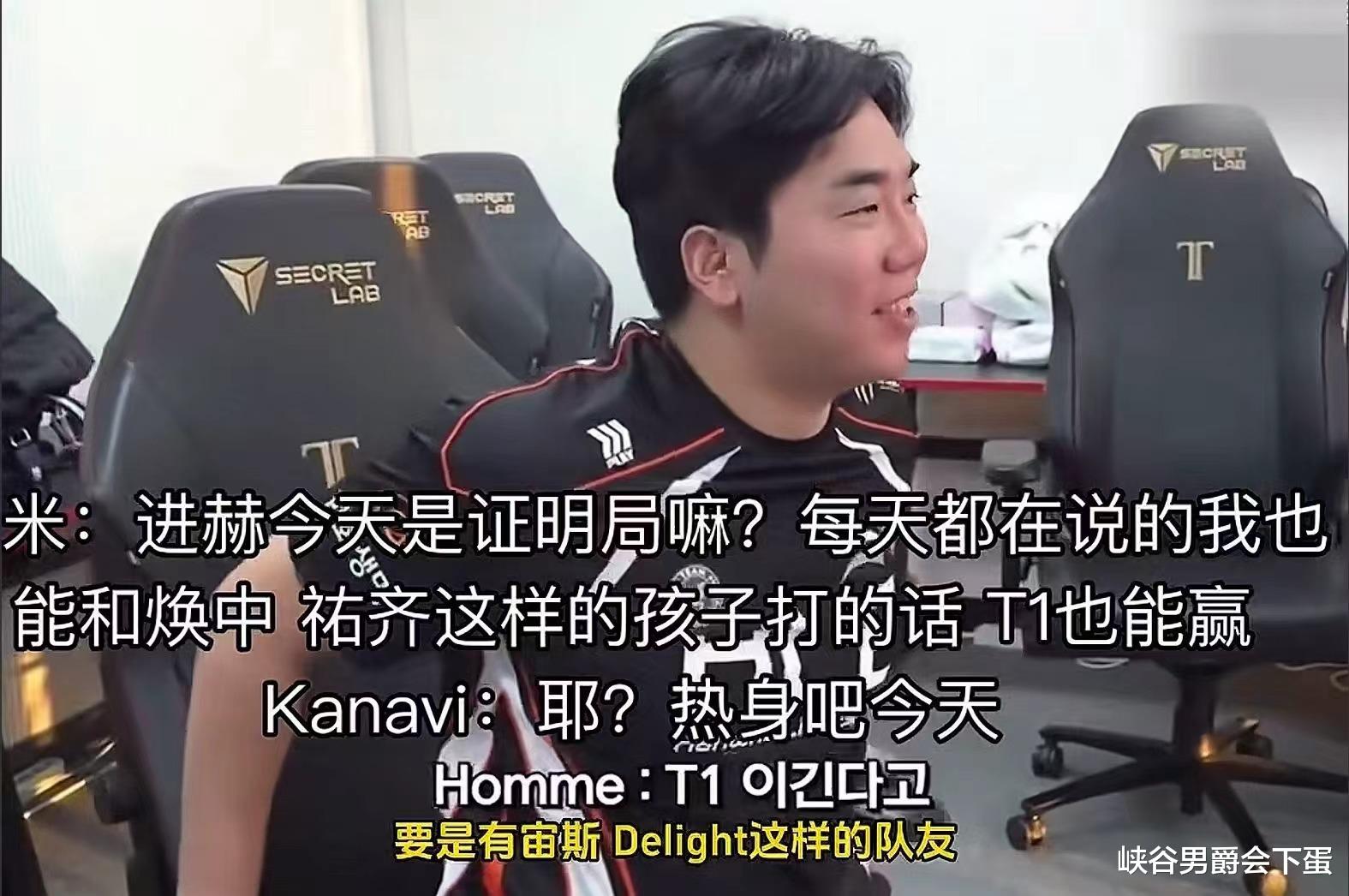 从视频中Homme教练说的话可以看出,Kanavi选手曾多次认为自己队友实力不行。目前他所在的HLE战队中Zeus选手是打上单的,Delight选手是打辅助的,那么可以认为Kanavi对于前队友369以及Hang的实力不认可,认为是因为他们导致最终没有战胜T1战队。