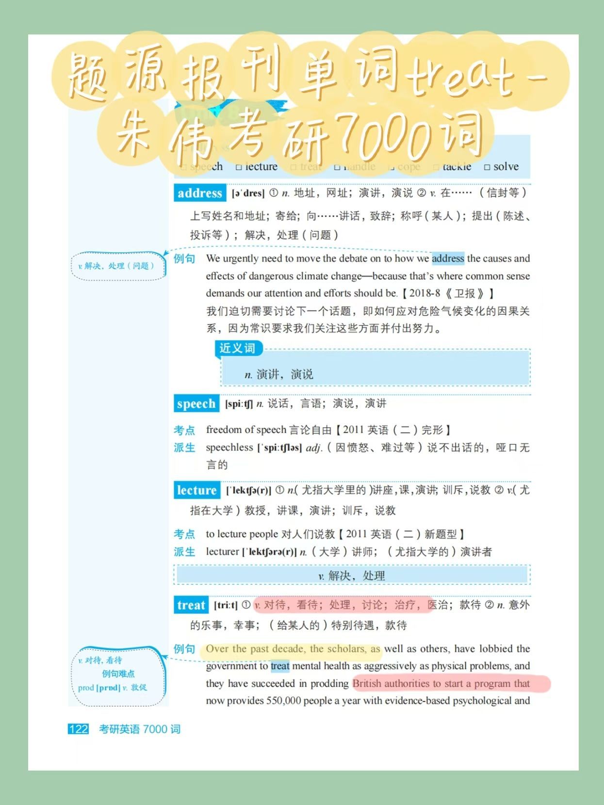 🌰举个例子吧!克拉克在2018年3月的《新闻周刊》中提到:"Over the past decade, scholars have lobbied the government to treat mental health as aggressively as physical problems."(在过去10年里,学者一直游说政府要像对待身体问题一样积极地对待精神健康问题。)这里,"treat"就表示"对待,看待"。