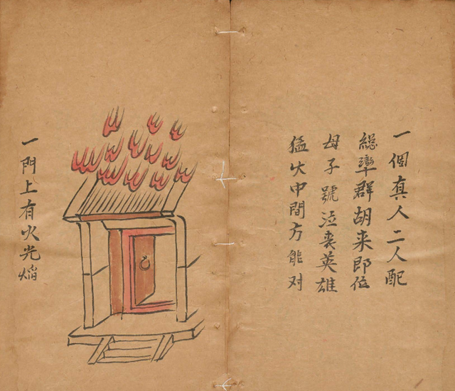 这幅卦象揭示的是一幅火焰熊熊的悲惨画面:一头强壮的梅花鹿被围困于火海之中,四周烈火熊熊,令人心惊胆战。两人目睹此卦,顿时惊恐万分,深知这预示着未来中原将陷入痛苦的战乱之中。
