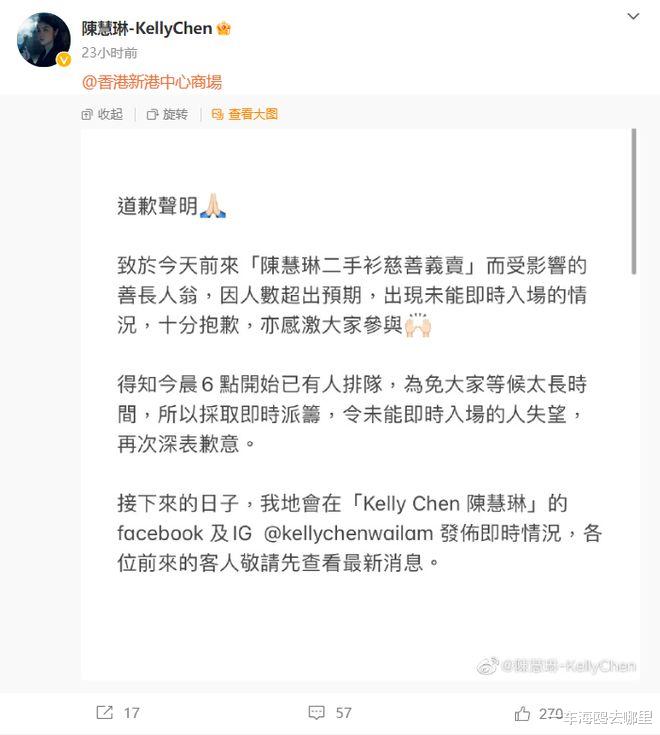 陈慧琳义卖二手衣物引疯抢,有人提前6小时排队,警方出动维持秩序