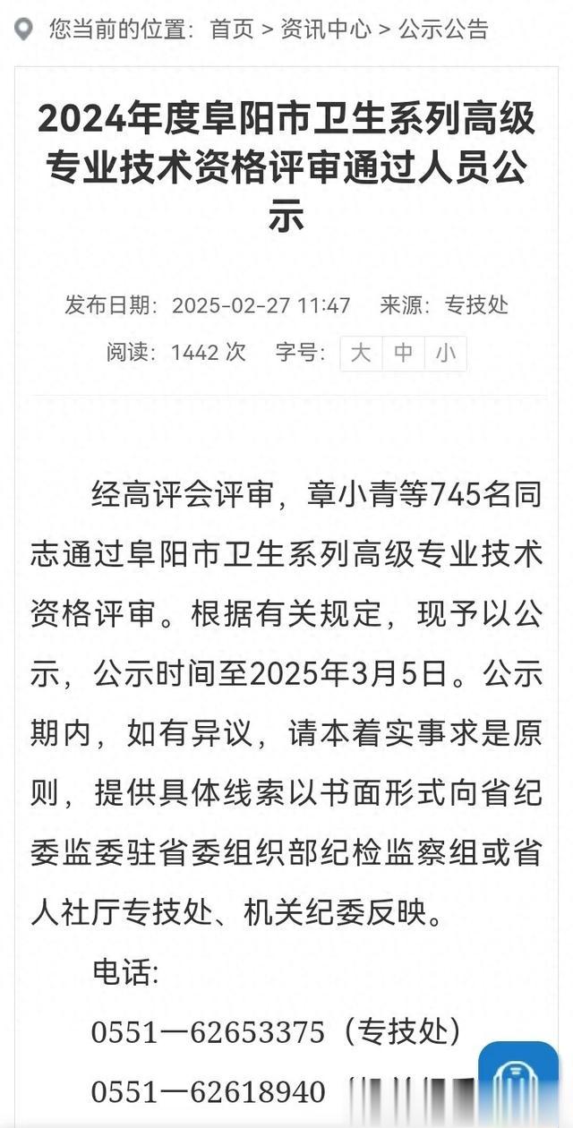 经高评会评审,章小青等745名同志通过阜阳市卫生系列高级专业技术资格评审。根据有关规定,现予以公示,公示时间至2025年3月5日。公示期内,如有异议,请本着实事求是原则,提供具体线索以书面形式向省纪委监委驻省委组织部纪检监察组或省人社厅专技处、机关纪委反映。
